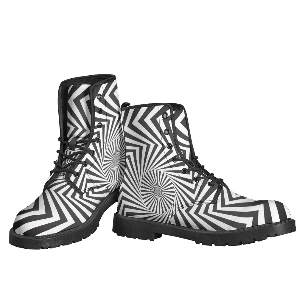 These Leather Lightweight Boots are a stylish and unique choice for any hippie looking to make a statement with their footwear. The angular swirl motion illusion print on the leather gives these boots a psychedelic and eye-catching look that is perfect for expressing individuality and creativity. The lightweight construction ensures comfort while walking or dancing at music festivals or outdoor gatherings. With a nod to retro style and a modern twist, these boots are perfect for hippies who want to stand out from the crowd and embrace their free-spirited nature.