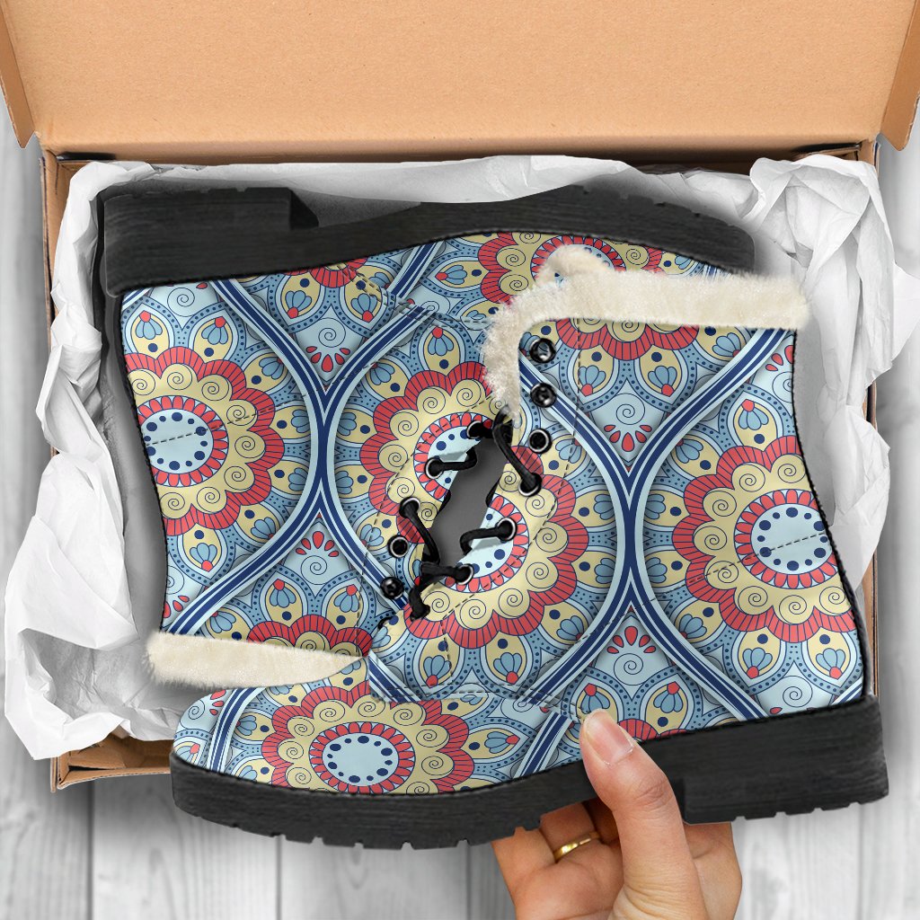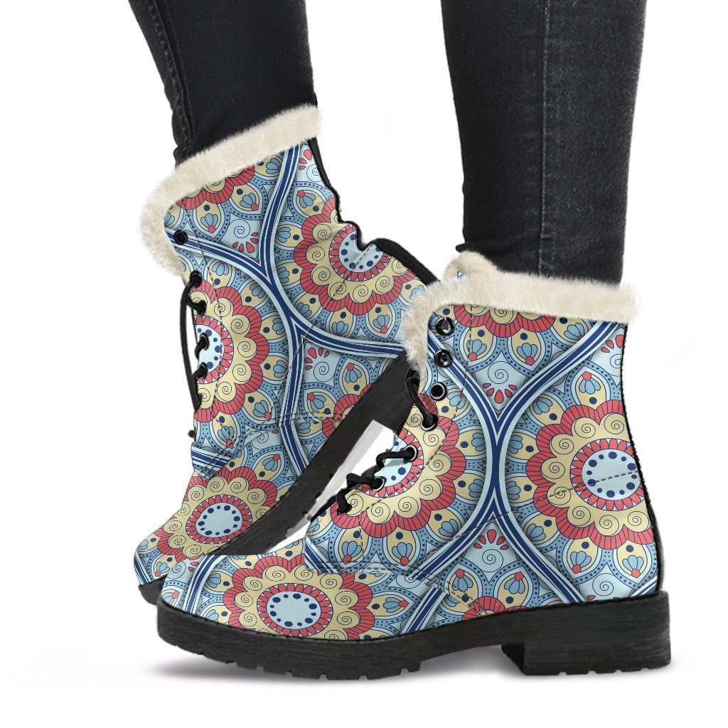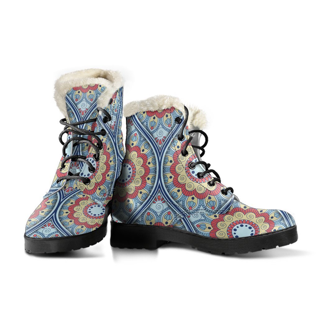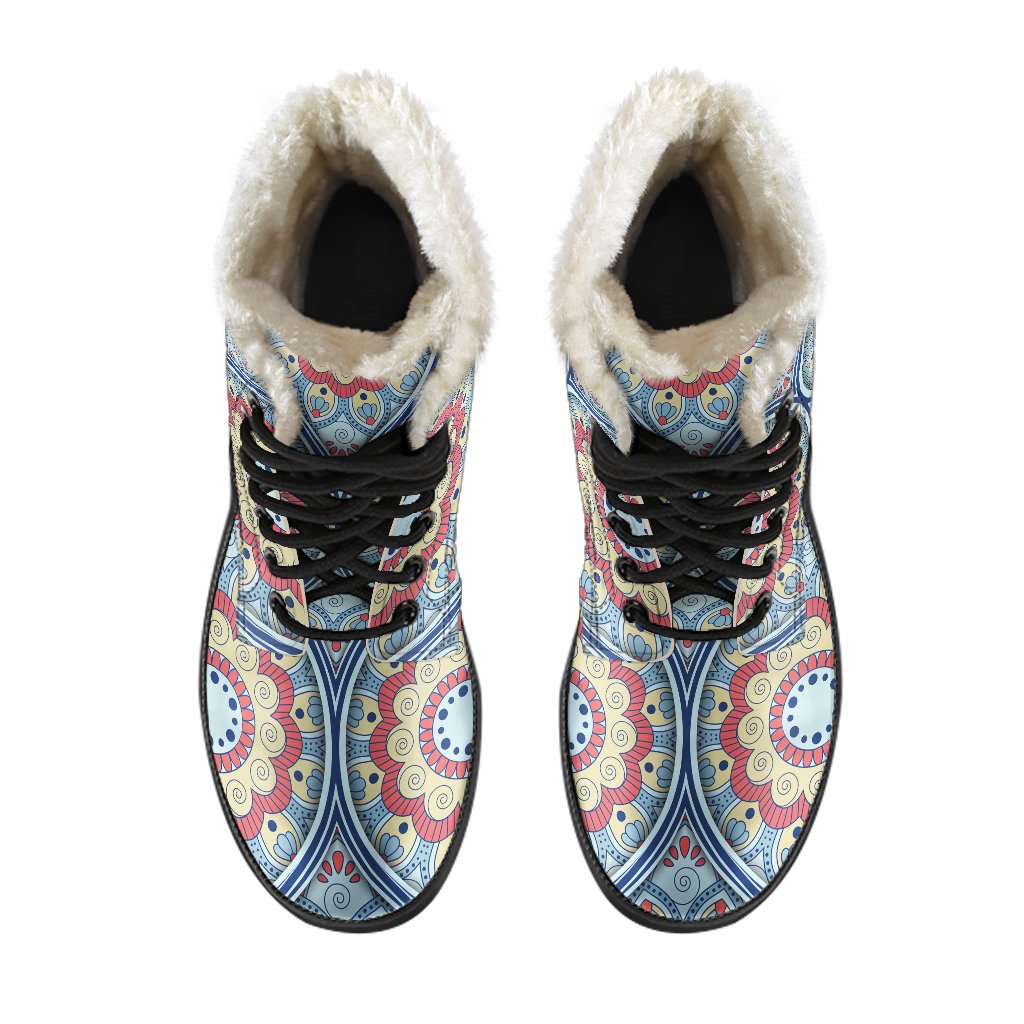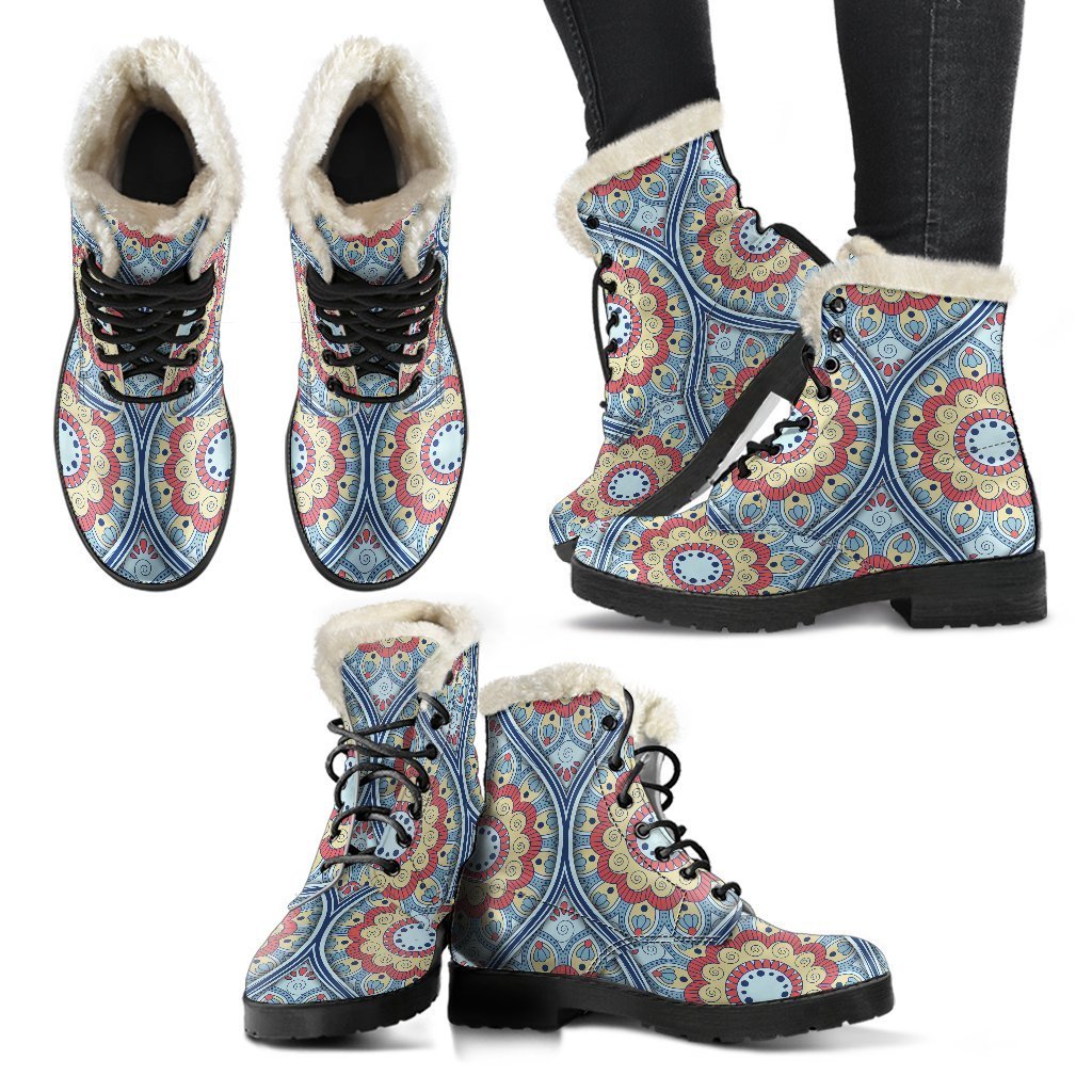 Embrace your inner hippie with these stunning Faux Fur Leather Boots featuring a unique pastel ornament mandala print. These bohemian-inspired boots are the perfect addition to any free-spirited wardrobe, adding a touch of whimsy and personality to any outfit. The faux fur lining provides warmth and comfort, while the leather exterior gives them a chic and stylish edge. Whether you're dancing at a music festival or simply strolling through the city streets, these boots will keep you feeling funky and fabulous. Channel your inner flower child and step out in style with these must-have hippie boots.