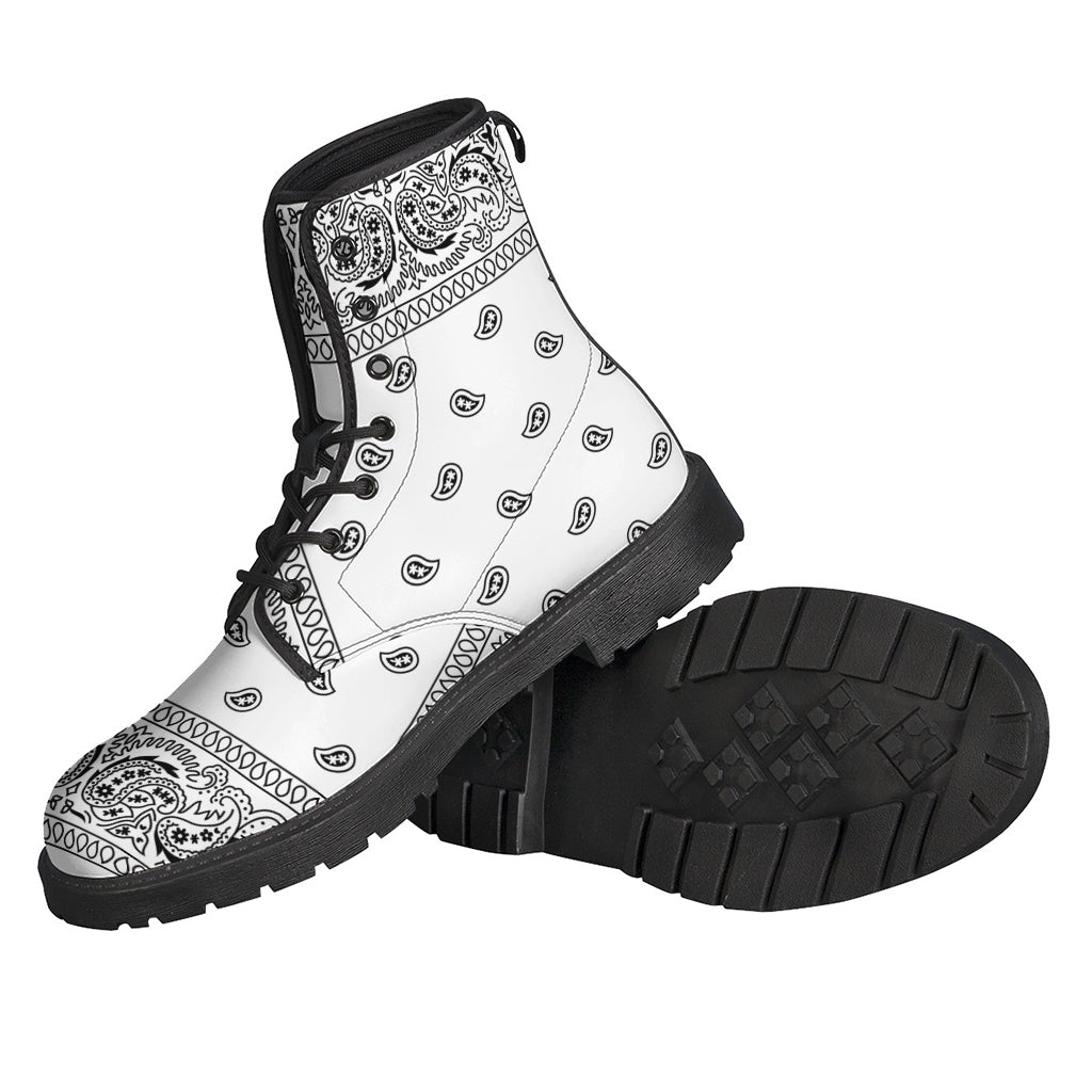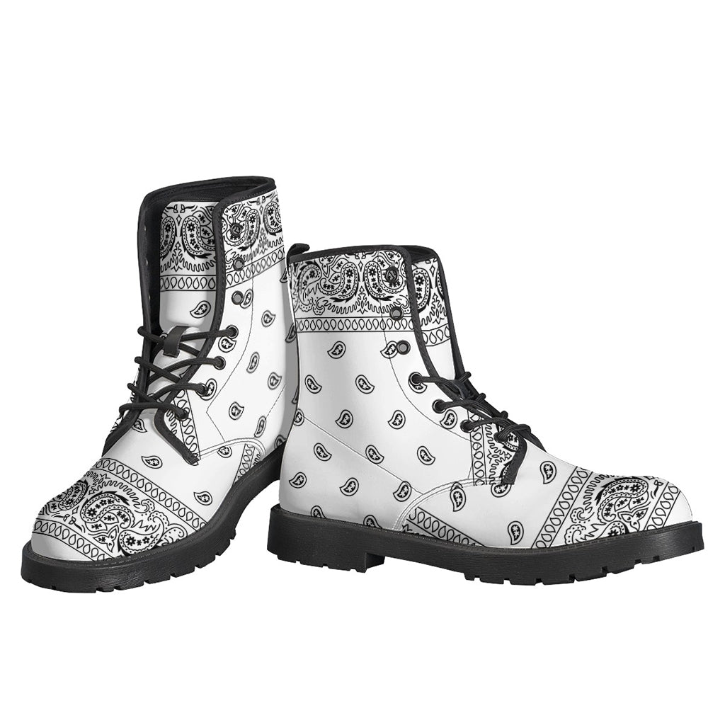 These Leather Lightweight Boots are perfect for hippies who want to add a touch of bohemian style to their wardrobe. The white and black paisley bandana print on the leather material gives these boots a unique and eye-catching look. The lightweight construction makes them comfortable for all-day wear, while the durable leather ensures long-lasting quality. Whether you're attending a music festival, heading to a farmer's market, or just hanging out with friends, these hippie-style boots are sure to make a statement.