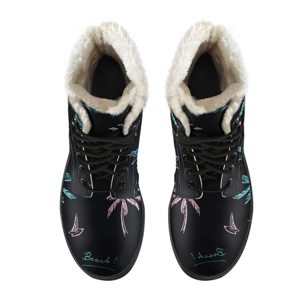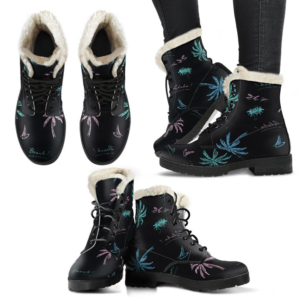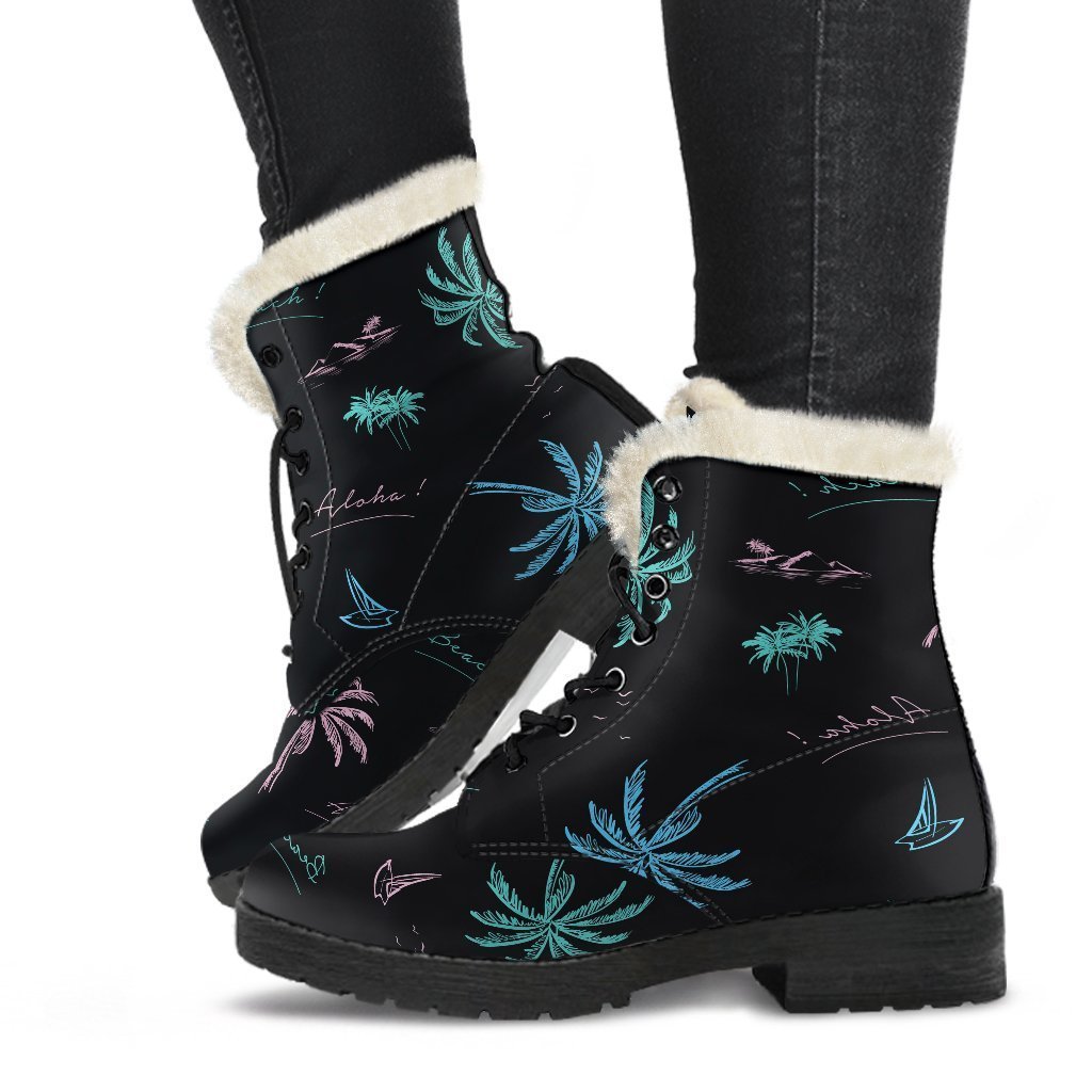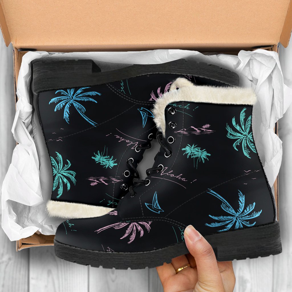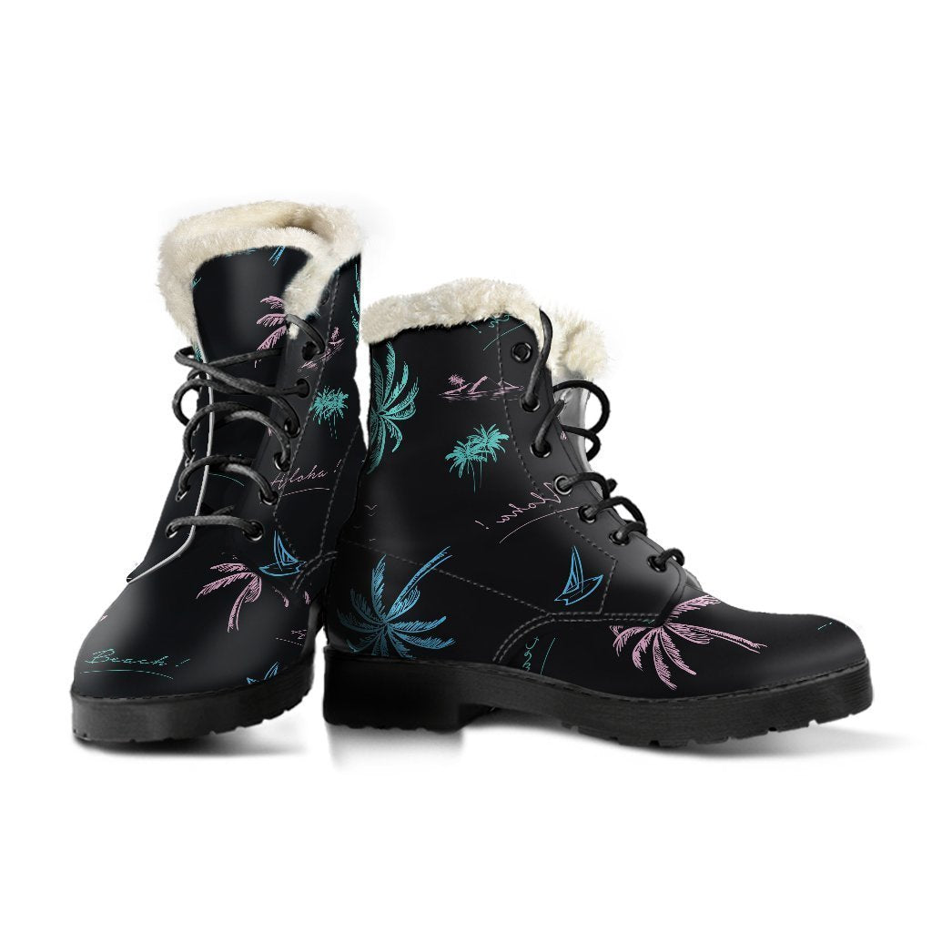 Bring out your inner bohemian spirit with these stylish hippie faux fur leather boots. The unique palm tree and summer beach pattern print adds a touch of whimsy and fun to any outfit. Perfect for festival season or just adding a touch of retro flair to your everyday look. These boots are not only fashionable but also comfortable, making them the perfect choice for those long days of dancing and exploring. Step out in style with these groovy hippie boots and show off your free-spirited style.