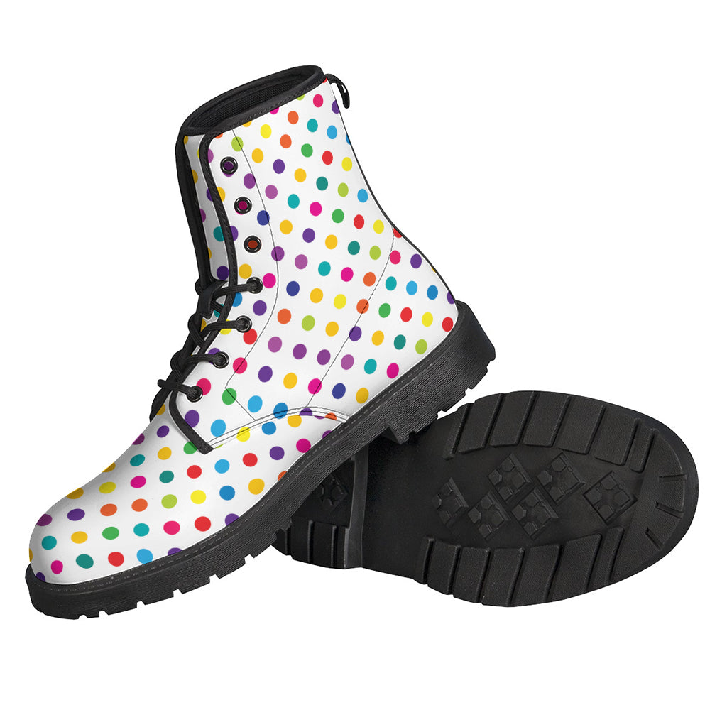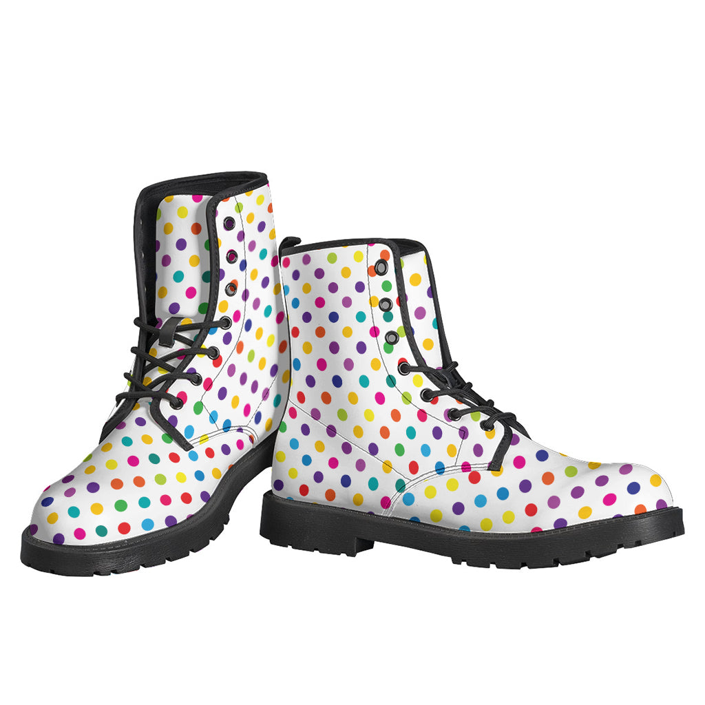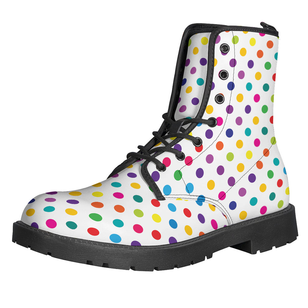 Get groovy with these Colorful Polka Dot Pattern Print Leather Boots perfect for the free-spirited hippie in you. Made from lightweight leather, these boots feature a funky polka dot design that will add a pop of color to any outfit. Whether you're dancing at a music festival or strolling through the park, these boots will provide both style and comfort. Embrace your inner hippie and step out in style with these unique and eclectic boots.