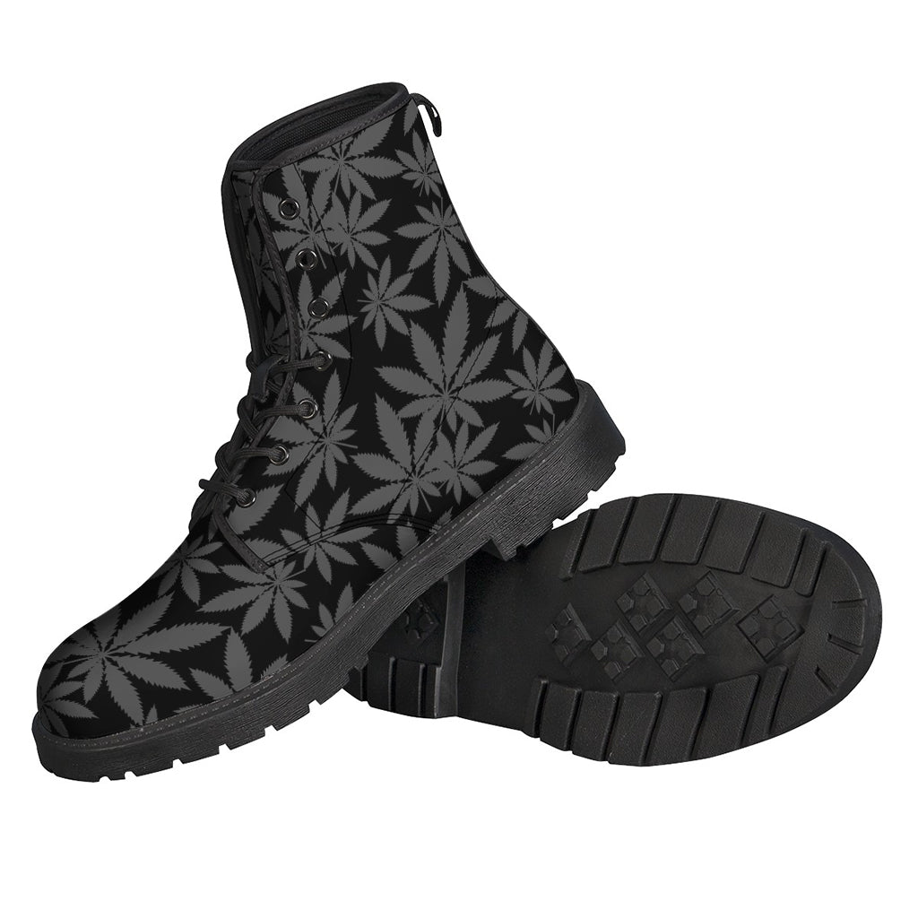 These Leather Lightweight Boots are perfect for any modern-day hippie looking to add a touch of style to their wardrobe. Featuring a unique black and grey pot leaf pattern print, these boots are sure to make a statement wherever you go. The lightweight design ensures all-day comfort, while the durable leather construction guarantees long-lasting wear. Whether you're heading to a music festival or just running errands around town, these hippie-inspired boots are a must-have for any free spirit. Get ready to step out in style with these unique and fashionable leather boots.