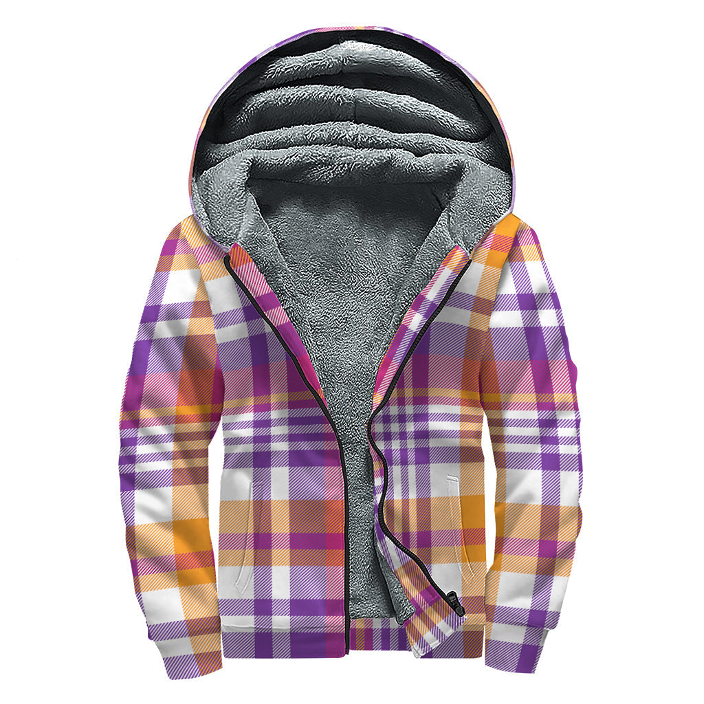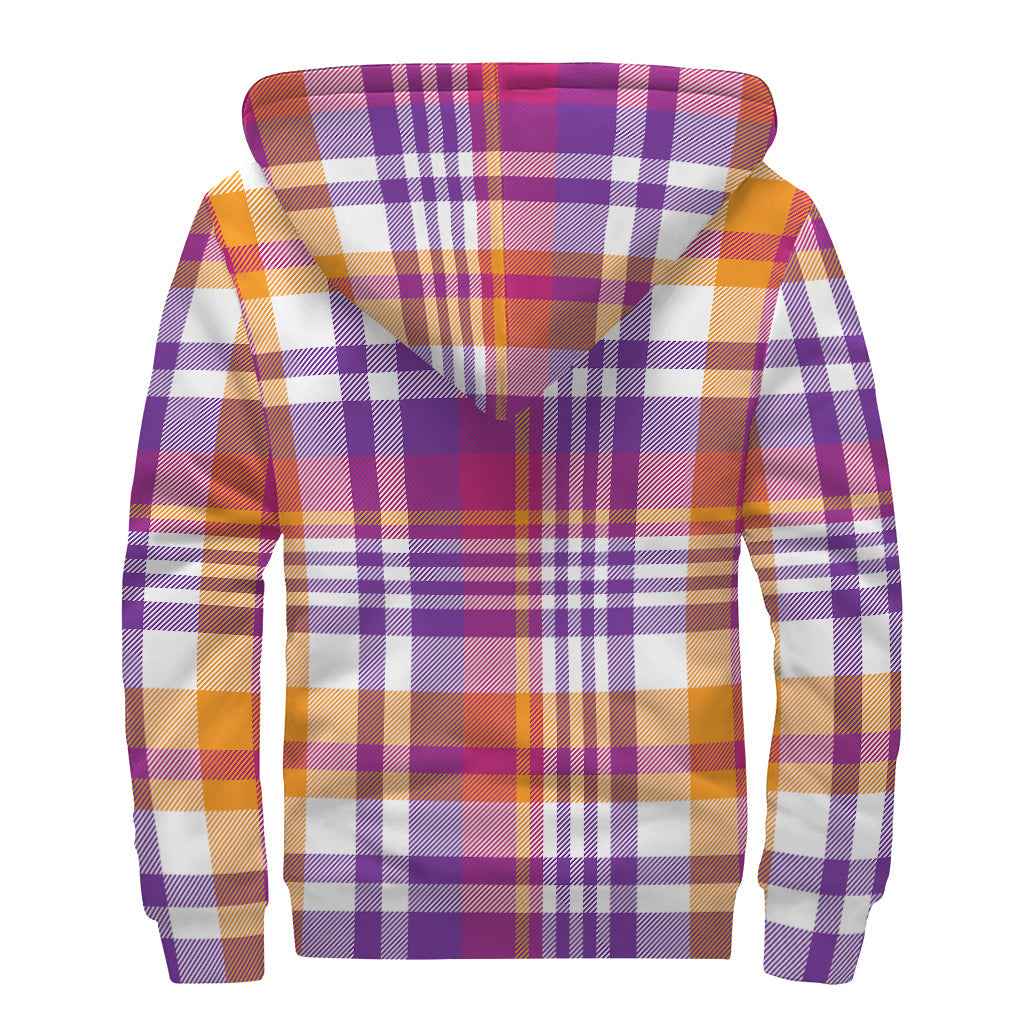 Groovy Purple and Orange Madras Plaid Sherpa Lined Zip Up Hoodie for Hippie Vibes