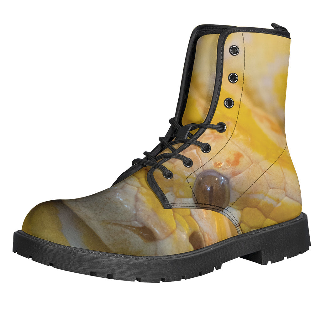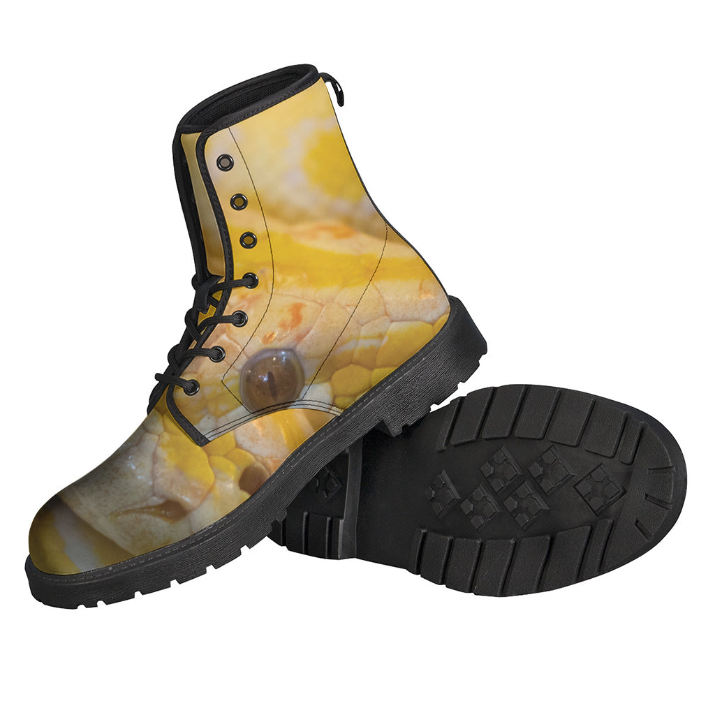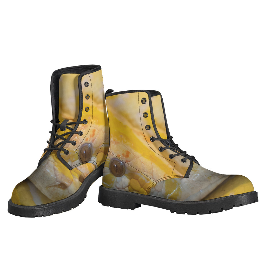 These Yellow and White Python Snake Print Leather Boots are the epitome of hippie style. Crafted from lightweight leather, these boots feature a bold and eye-catching python snake print in shades of yellow and white. The unique pattern adds a touch of bohemian flair to any outfit, while the comfortable leather construction ensures all-day wearability. Perfect for adding a statement piece to your wardrobe, these boots are a must-have for any modern-day hippie looking to make a stylish statement.