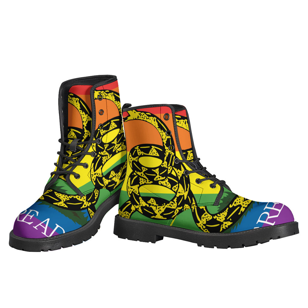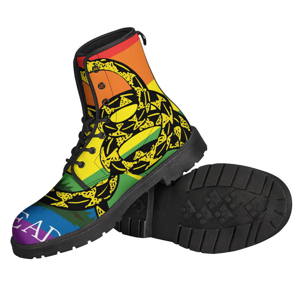 Step out in style with these unique Hippies Leather Lightweight Boots. Made from high-quality leather, these boots feature a striking LGBT Rainbow Gadsden Flag print that will surely make a statement wherever you go. The lightweight design ensures comfort for all-day wear, while the sturdy construction guarantees durability for long-lasting use. Whether you're hitting the streets or heading to a music festival, these boots are the perfect addition to any hippie-inspired outfit. Embrace your individuality and stand out from the crowd with these stylish and eye-catching Leather Lightweight Boots.
