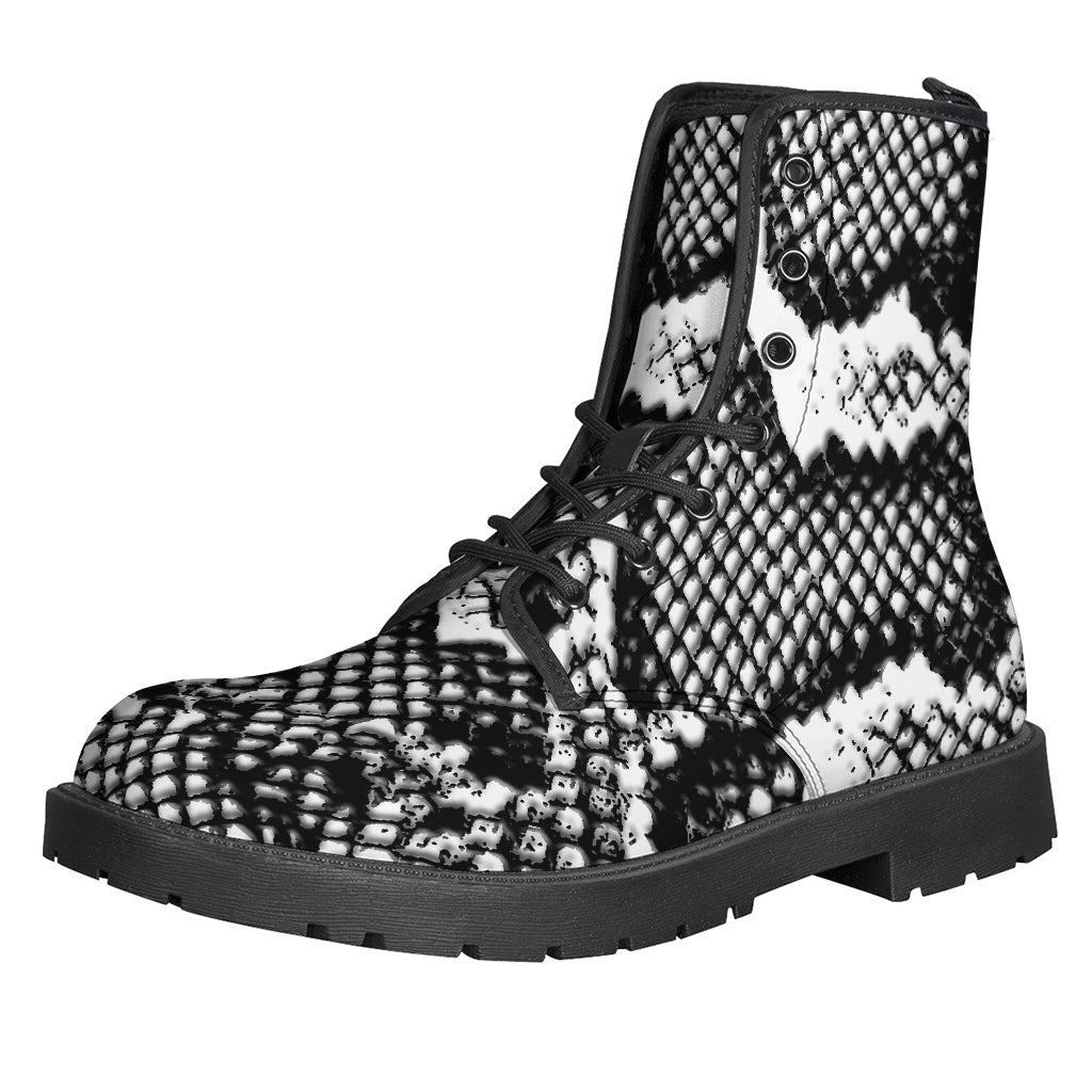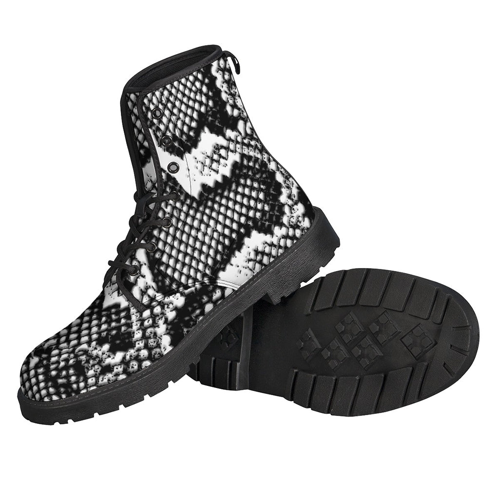 These black and white snakeskin print leather boots are the epitome of hippie style and attitude. Made from lightweight leather, they are perfect for long days of grooving at music festivals or exploring nature. The unique snakeskin print adds a touch of bohemian flair, while the sturdy construction ensures they will last through all your adventures. With a comfortable fit and stylish design, these boots are a must-have for any modern-day hippie looking to add some extra flair to their wardrobe.