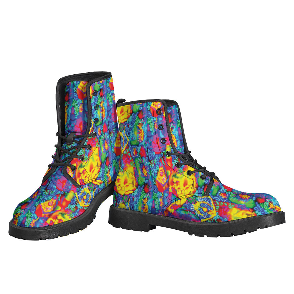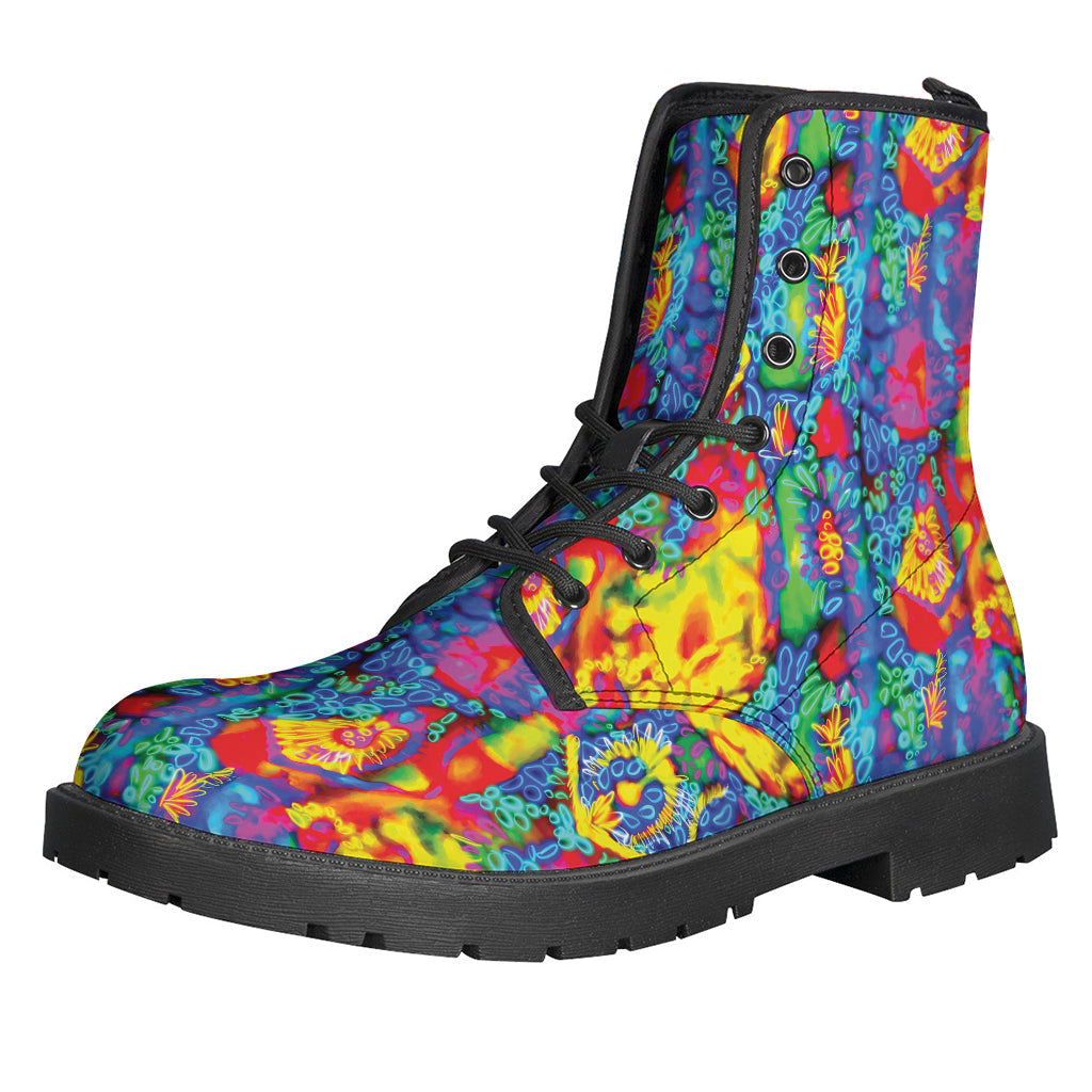 Unleash your inner hippie with these Abstract Psychedelic Print Leather Boots. Made for the free spirits and trendsetters, these lightweight leather boots feature a vibrant and unique psychedelic print that is sure to turn heads wherever you go. The comfortable design and high-quality materials make them perfect for all-day wear, while the bold print adds a touch of 70s-inspired style to any outfit. Whether you're heading to a festival, exploring the great outdoors, or simply looking to make a statement, these boots are a must-have addition to your wardrobe. Peace, love, and endless style await with these hippie-inspired leather boots.