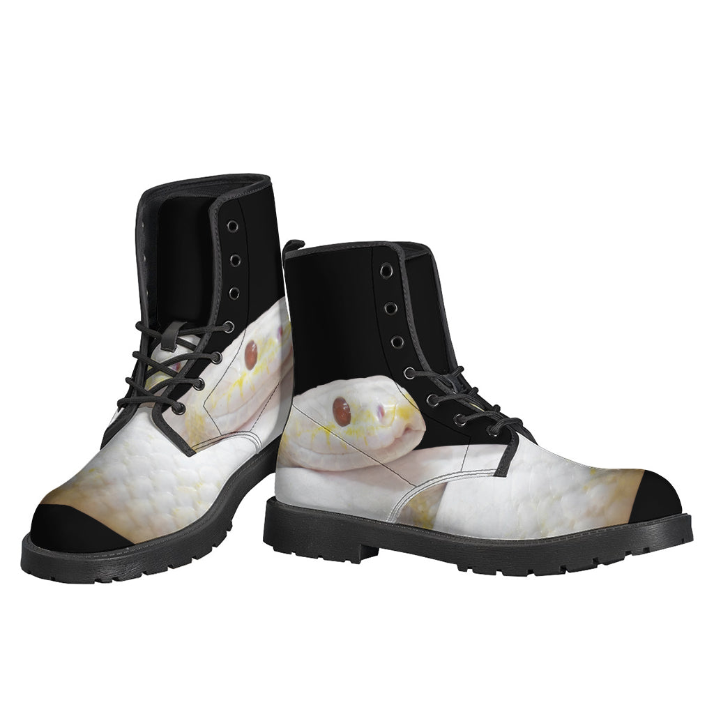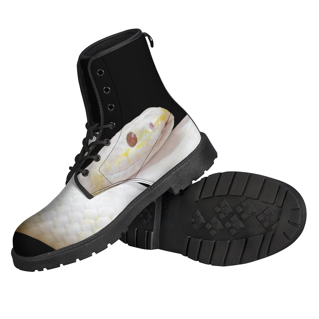 These Albino Snake Print Leather Boots are the perfect addition to any hippie's wardrobe. Made from lightweight leather, these boots combine durability with style. The unique snake print design adds a touch of bohemian flair, making them the ideal choice for those looking to make a fashion statement.