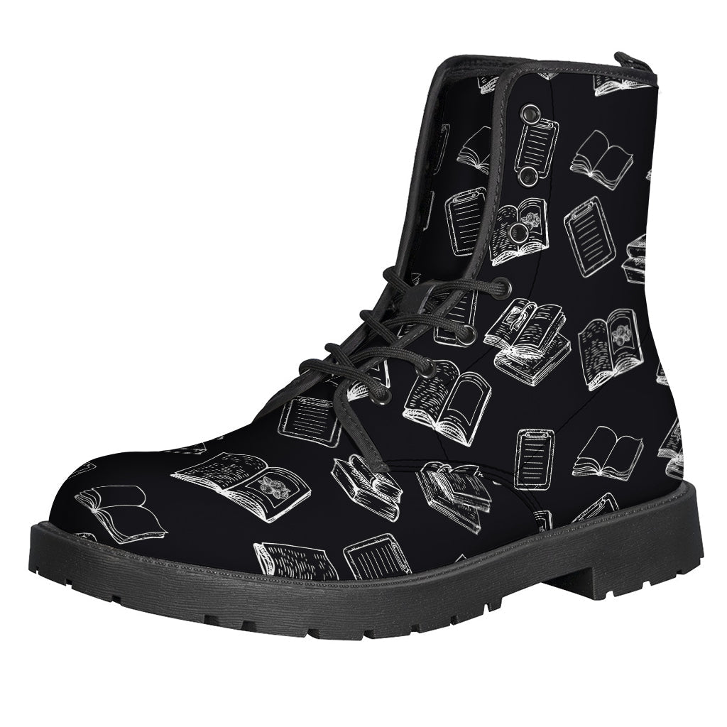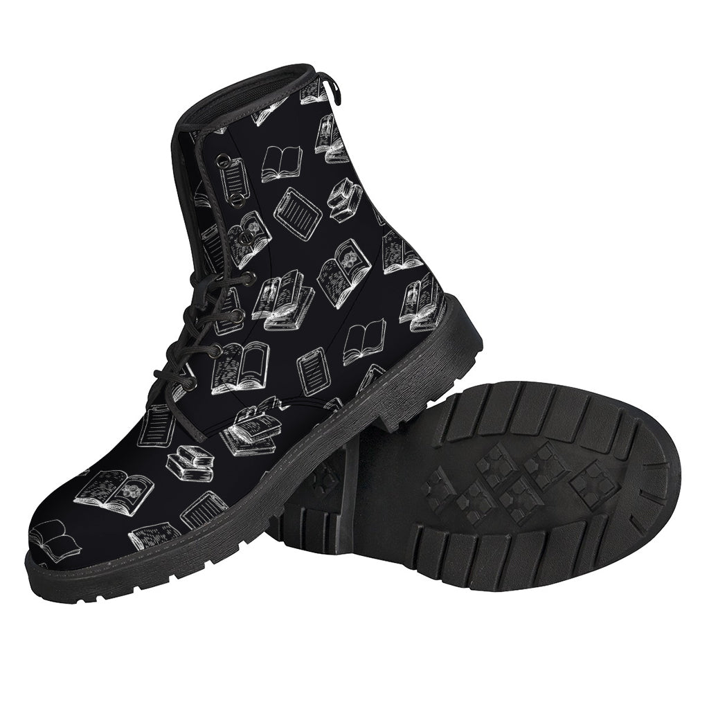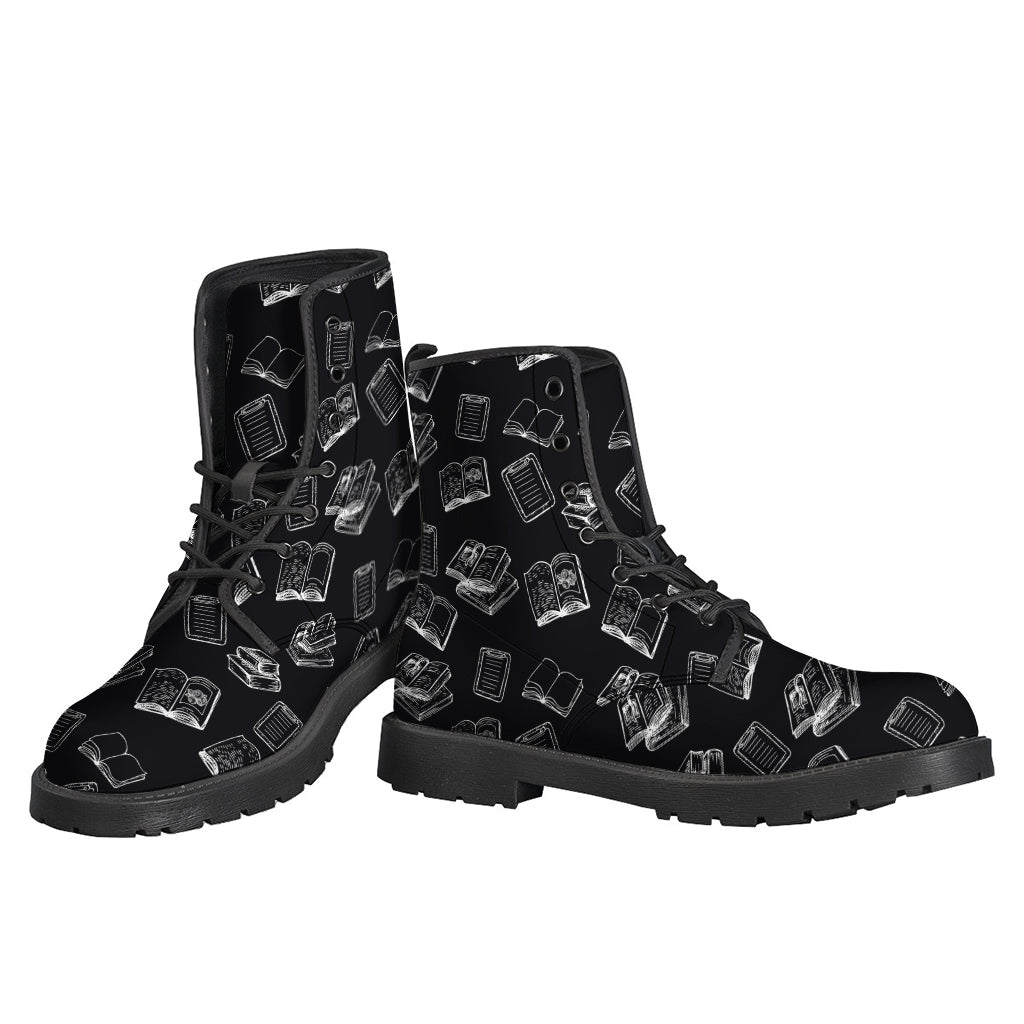 Get ready to step out in style with these hippie-inspired Leather Lightweight Boots. Made with high-quality leather, these boots feature a striking black and white books pattern print that adds a unique and edgy twist to your wardrobe. The lightweight construction ensures all-day comfort, while the sturdy sole provides durability and traction. Perfect for pairing with your favorite bohemian outfits, these boots will make a statement wherever you go. Embrace your inner hippie and rock these stylish Leather Lightweight Boots with confidence.