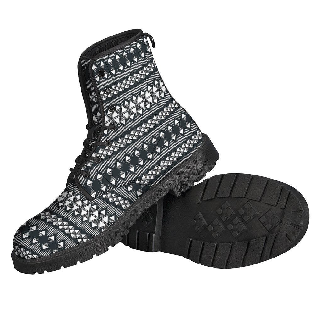 Step out in style with these unique and trendy Black and White Tribal Geometric Print Leather Boots inspired by hippie fashion. These lightweight boots are perfect for the free-spirited individual who loves to make a statement with their footwear. The intricate tribal geometric print adds a bohemian touch to any outfit, while the sleek leather material ensures durability and comfort. Whether you're heading to a music festival or simply looking to add a touch of hippie flair to your everyday look, these boots are sure to turn heads wherever you go. Embrace your inner hippie and step into a pair of these stylish Leather Lightweight Boots today!