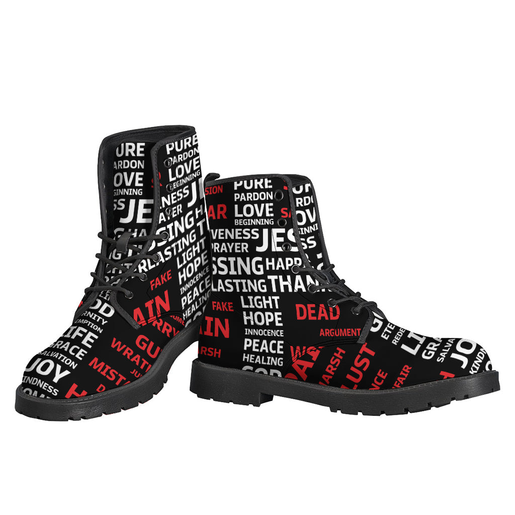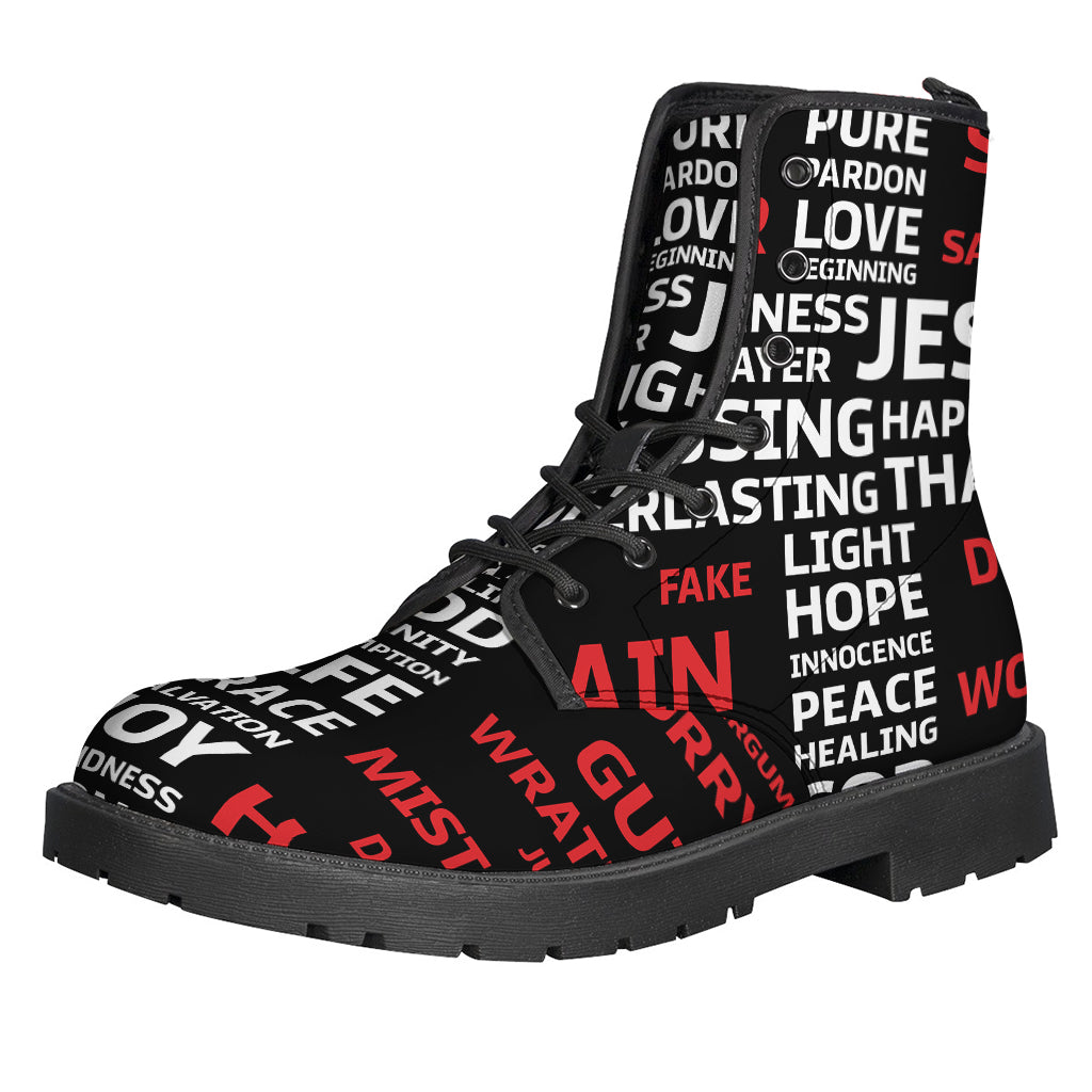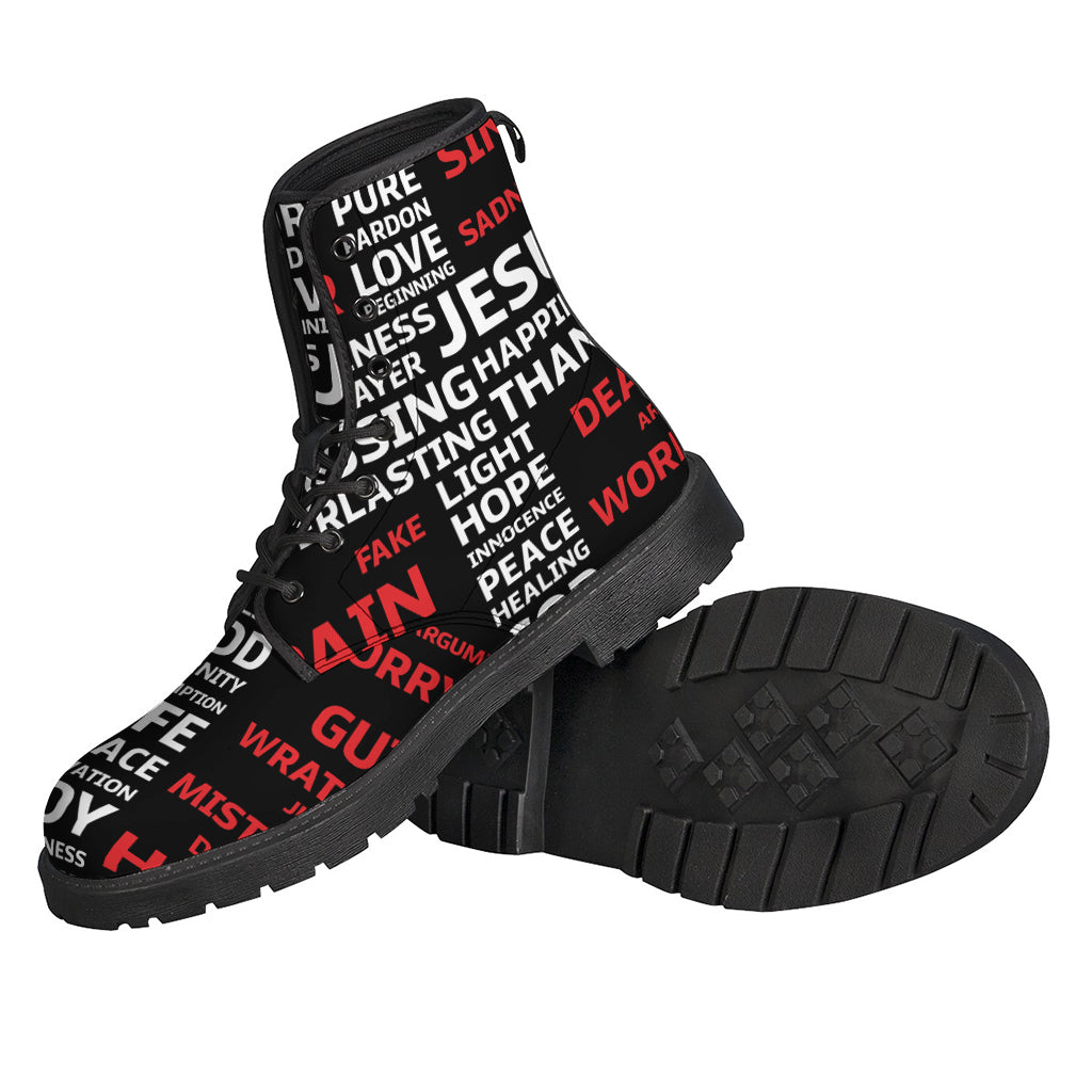 Step into ultimate coolness with these Hippies Leather Lightweight Boots! Featuring a stylish Christian cross and religious words print on genuine leather, these boots exude a unique and free-spirited vibe that is perfect for any hippie at heart. The lightweight design ensures all-day comfort, while the sturdy construction guarantees durability for all your adventures. Embrace your inner hippie and let your footwear make a statement with these fabulous boots.