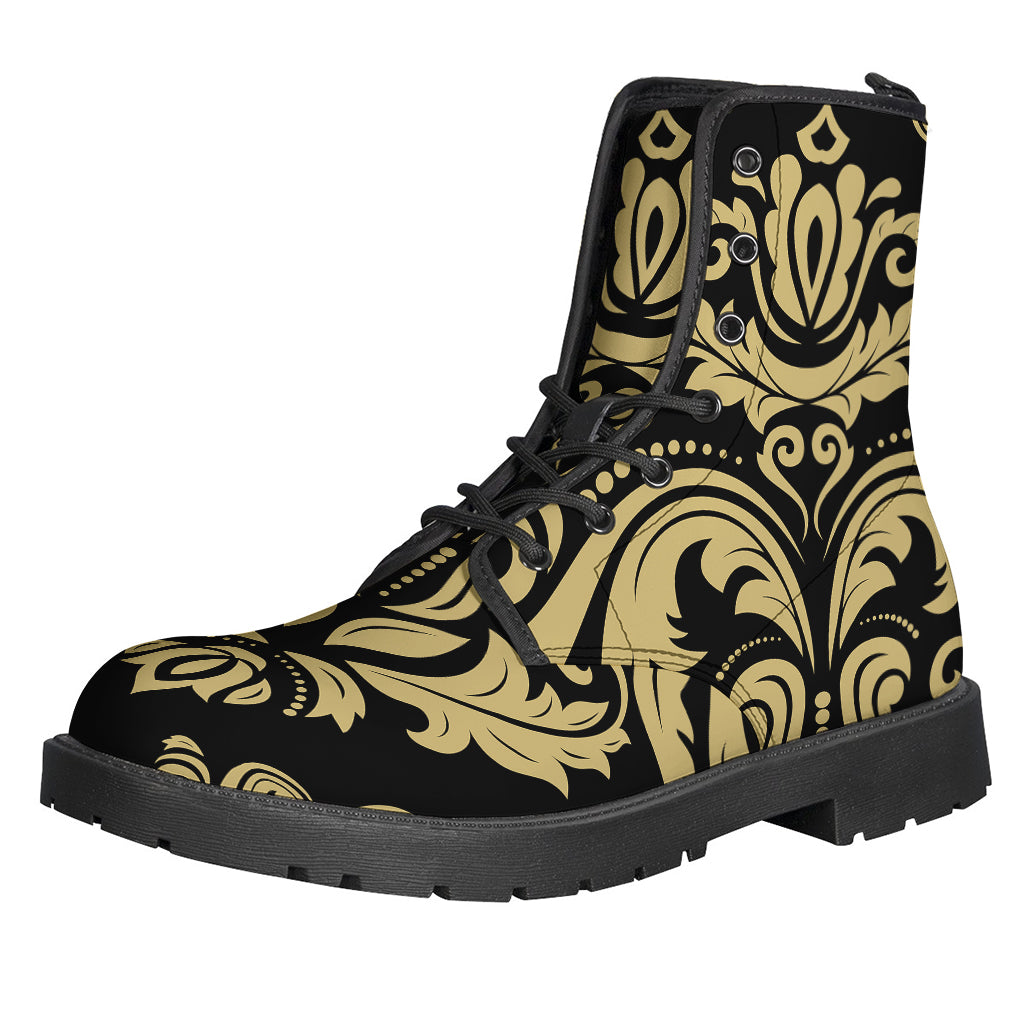 Step out in style with these incredible Black and Beige Damask Pattern Print Leather Boots. Perfect for any bohemian and free-spirited individual, these boots combine the essence of hippie culture with a touch of modern flair. Made from lightweight leather, they are comfortable and durable, making them perfect for any adventure. The unique damask pattern print adds a pop of personality to any outfit, while the black and beige color scheme keeps them versatile and easy to pair with your favorite boho-chic ensembles. Embrace your inner hippie and show off your style with these fabulous Leather Lightweight Boots.