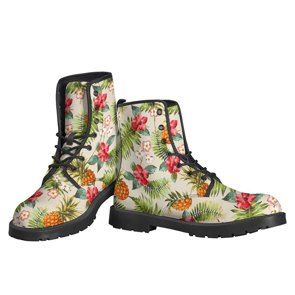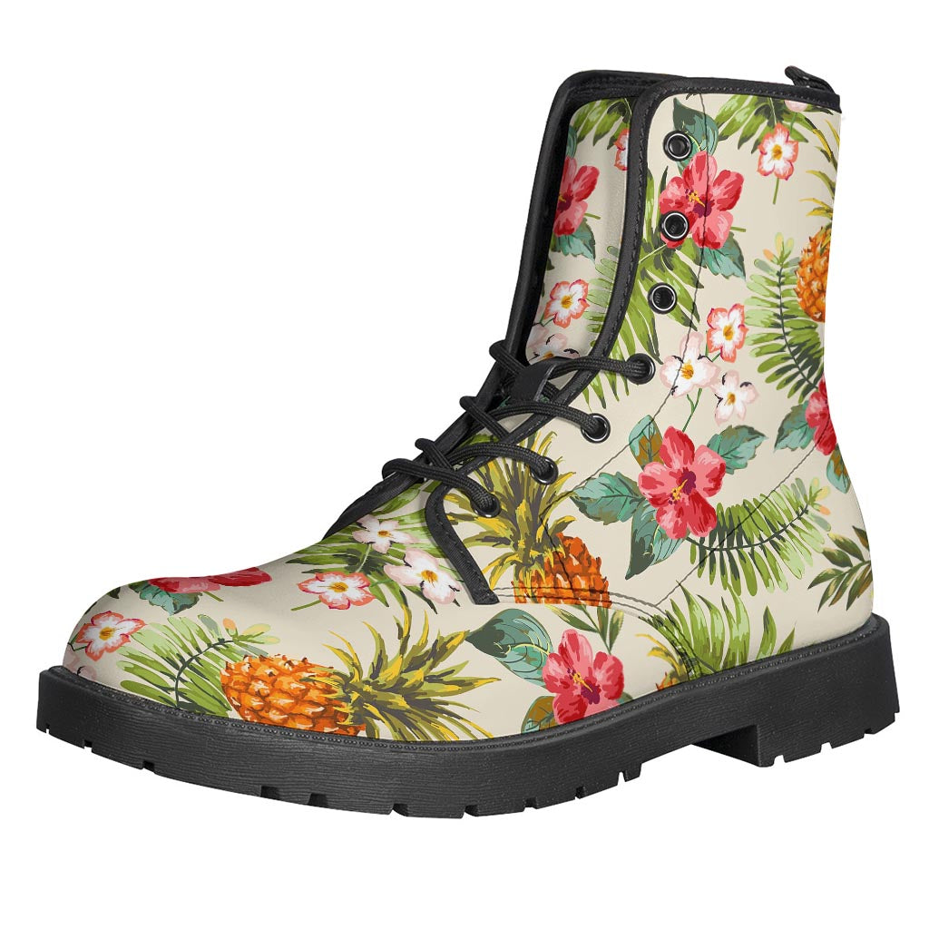 These Hippies Leather Lightweight Boots are perfect for those who love the hippie style. The boots feature a unique white aloha pineapple pattern print that adds a fun and playful touch to any outfit. Made from high-quality leather, these boots are durable and built to last. The lightweight design makes them comfortable to wear all day long, whether you're out exploring nature or dancing at a music festival. These boots are a stylish and practical choice for any free-spirited individual looking to add a touch of hippie flair to their wardrobe.