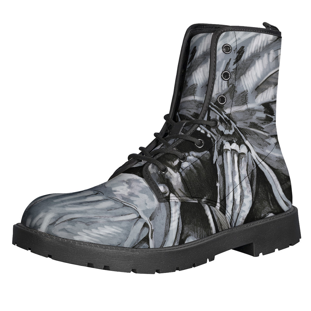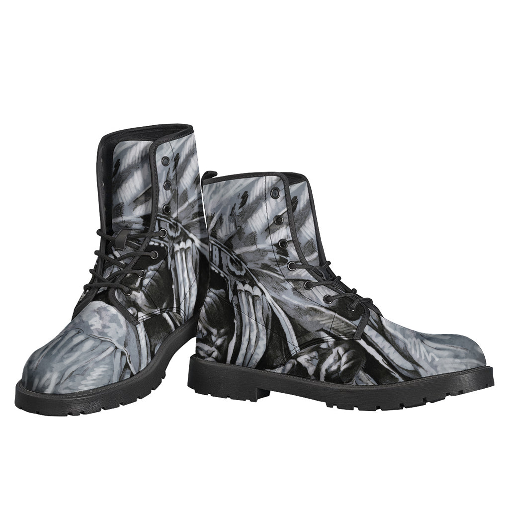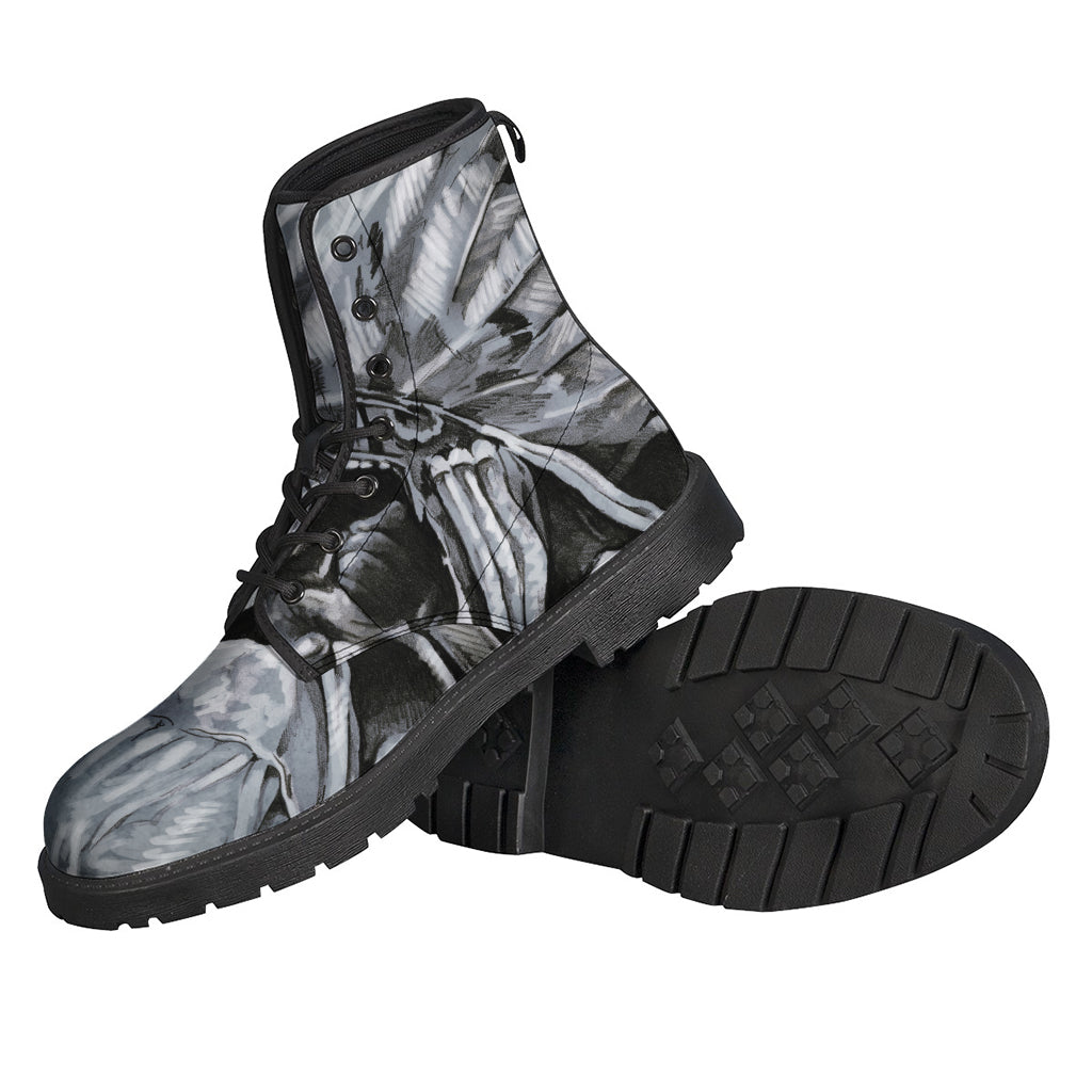 These Lightweight Boots are the perfect combination of hippie style and quality materials. With a stunning monochrome Native Indian portrait print on the leather, these boots are both unique and eye-catching. The lightweight design makes them comfortable for all-day wear, while the durable leather ensures they will last for years to come. Whether you're heading to a music festival or just want to add a touch of bohemian flair to your everyday look, these Leather Lightweight Boots are the perfect choice. Available in various sizes to fit any foot comfortably.