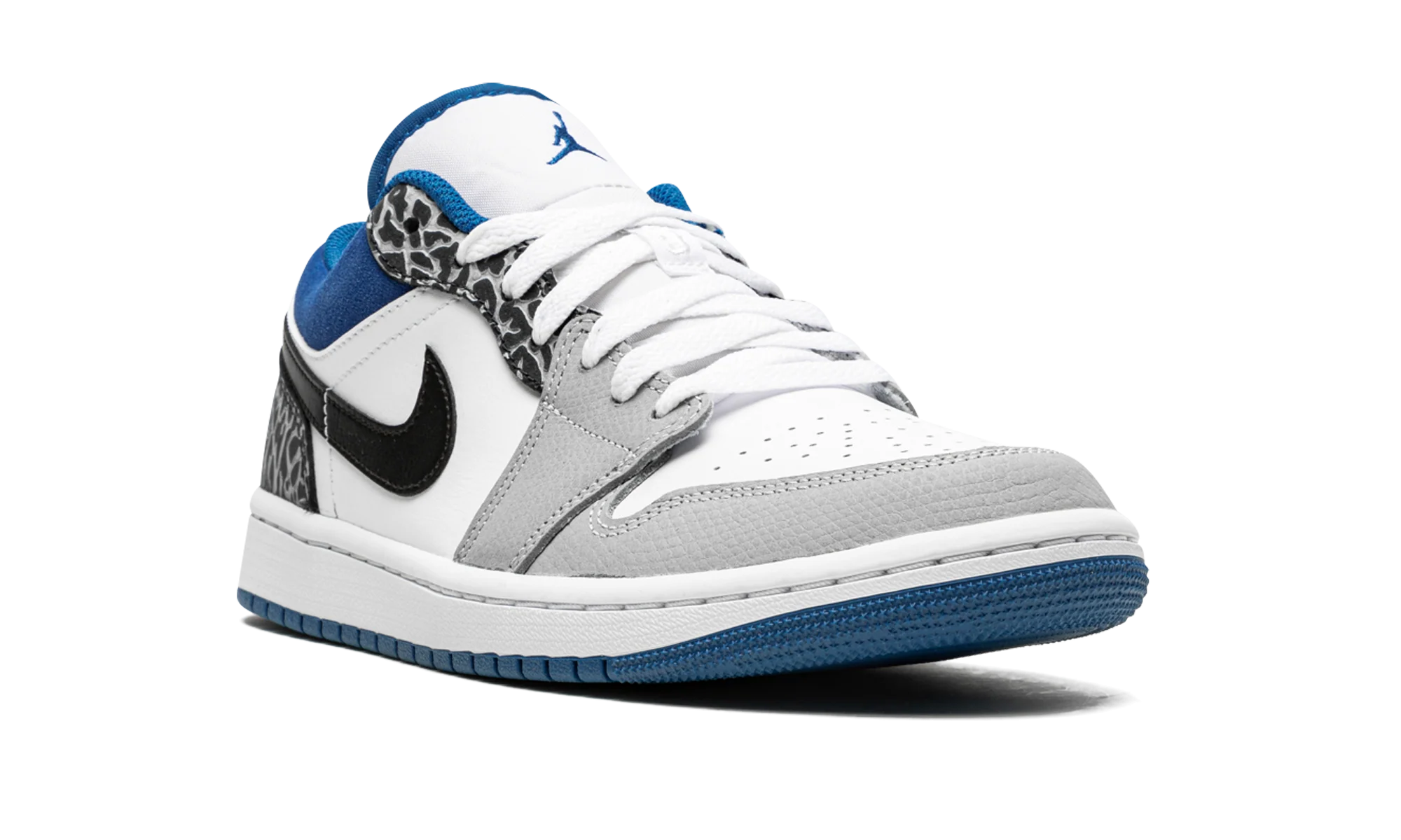 The Air Jordan 1 Low SE “True Blue” is a colorway of Michael Jordan’s first signature shoe that pays homage to the original Air Jordan 3 theme of the same name. A June 2022 release by Jordan Brand, the “True Blue” Jordan 1 Low SE features design elements and colors lifted from the Jordan 3 “True Blue” that was originally released in 1988. The perforated toe and mid-panel are designed in white leather. Contrasting light grey leather appears on the toe cap and forefoot. Classic elephant patterning is found on the upper eyelet panel and on the heel with blue “Wings” embroidery. A black leather Swoosh resides on the sides. A Dark Marina Blue Jumpman logo appears on the white leather tongue. Additional blue accenting comes into play on the suede collar and on the underside of the tongue.