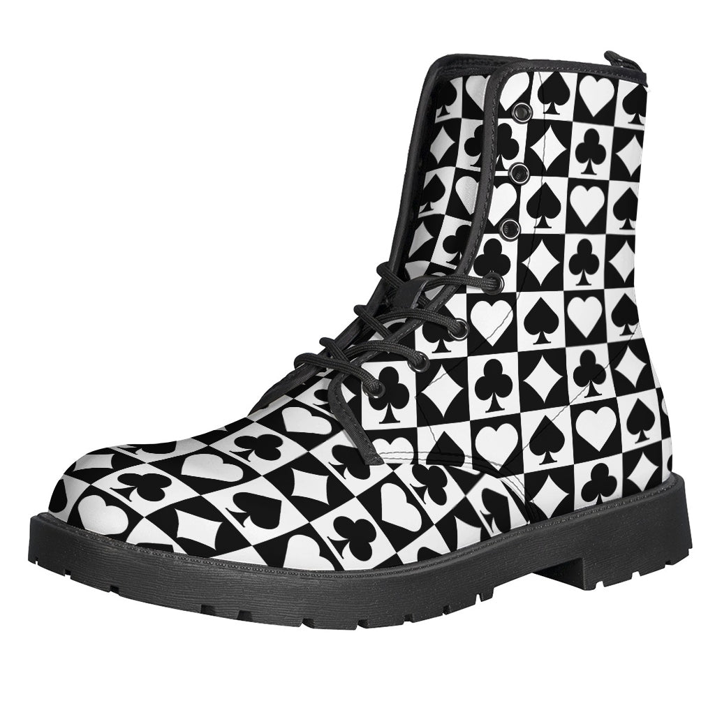 Channel your inner flower child with our Hippies Leather Lightweight Boots featuring a bold black and white playing card suits print. These boots are a perfect blend of retro vibes and modern style, making them a unique addition to your wardrobe. The lightweight design ensures all-day comfort while the durable leather construction ensures long-lasting wear. Whether you're going to a music festival or just looking to add a touch of bohemian flair to your outfit, these boots are sure to make a statement. Embrace your free spirit and step out in style with our Hippies Leather Lightweight Boots.