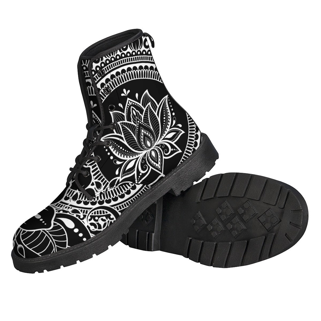 Embrace your inner free spirit with these stylish Hippies Leather Lightweight Boots. Featuring a unique black and white lotus flower print on genuine leather, these boots are perfect for adding a bohemian touch to your wardrobe. The lightweight design makes them a comfortable choice for all-day wear, while the durable construction ensures long-lasting quality. Whether you're attending a music festival, exploring the great outdoors, or simply looking to make a fashion statement, these boots are sure to turn heads wherever you go. Embody the laid-back, carefree attitude of the hippie movement with these trendy and versatile boots.