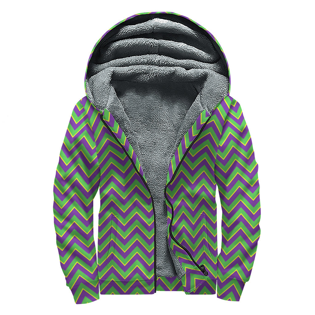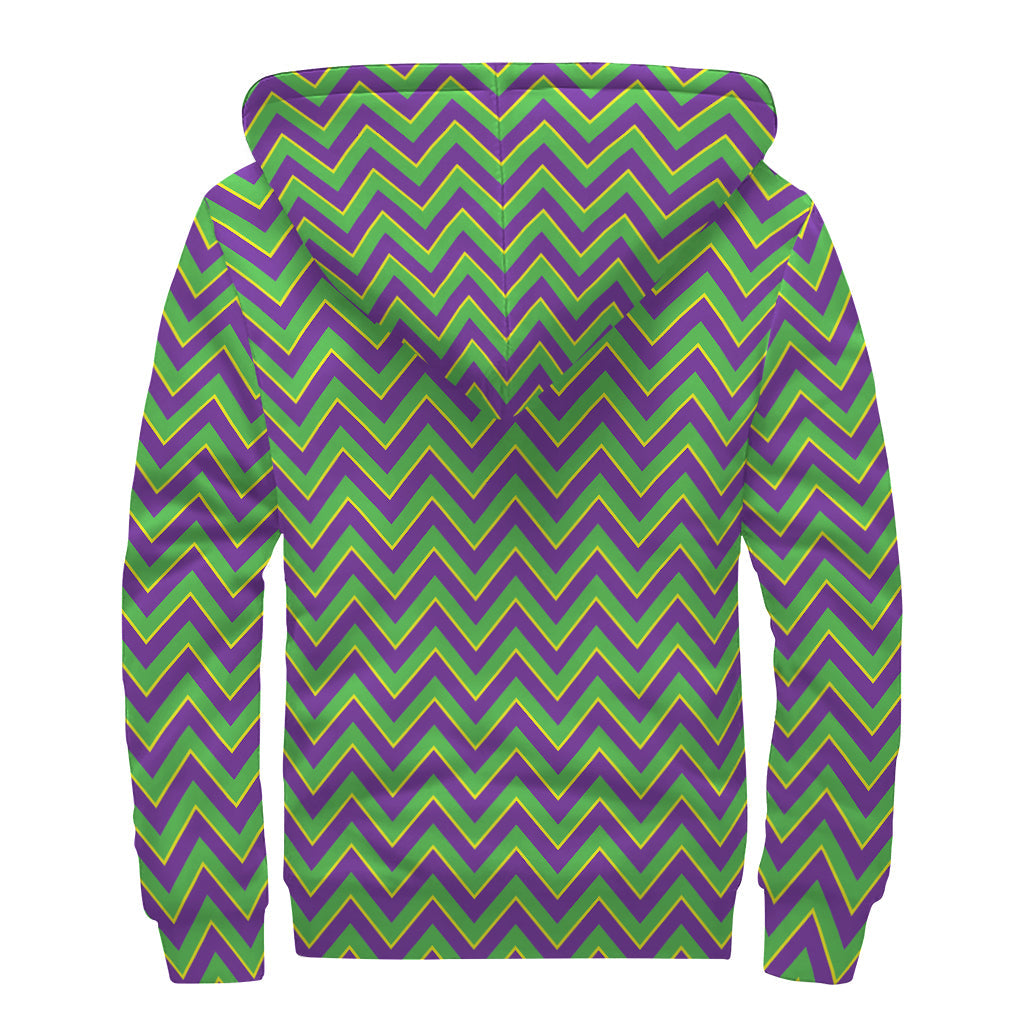 Get ready to embrace your inner hippie with this Sherpa Lined Zip Up Hoodie. This colorful Mardi Gras zigzag pattern print is perfect for adding a pop of fun to your wardrobe. The cozy sherpa lining will keep you warm and comfortable, while the zip-up design allows for easy layering. Whether you're heading to a music festival or just running errands around town, this hoodie is the perfect way to express your bohemian style. So channel your inner flower child and rock this groovy hoodie with peace and love!