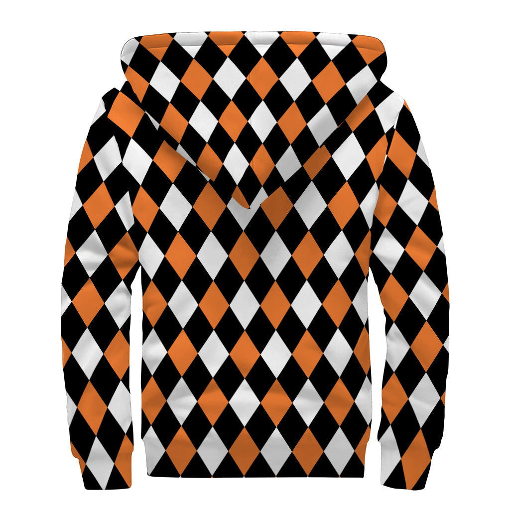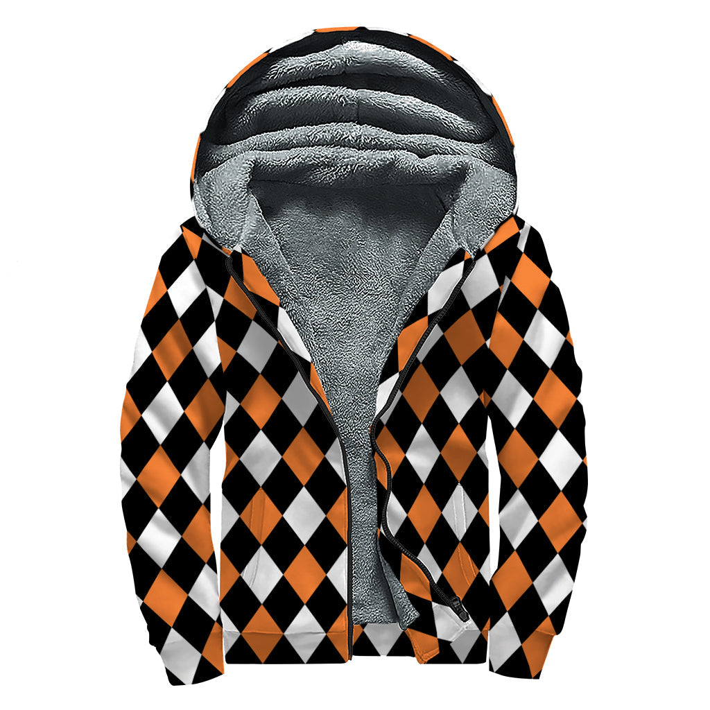 Embrace your inner hippie with this vibrant and cozy Sherpa Lined Zip Up Hoodie featuring an eye-catching orange, black, and white harlequin print. This funky and retro-inspired hoodie is perfect for adding a touch of 70s style to your wardrobe. The Sherpa lining adds extra warmth and comfort, making it ideal for chilly days and nights. Whether you're headed to a music festival, camping trip, or simply running errands around town, this hoodie is sure to keep you feeling and looking groovy. Stay warm, stylish, and effortlessly cool with this must-have hippie fashion piece.