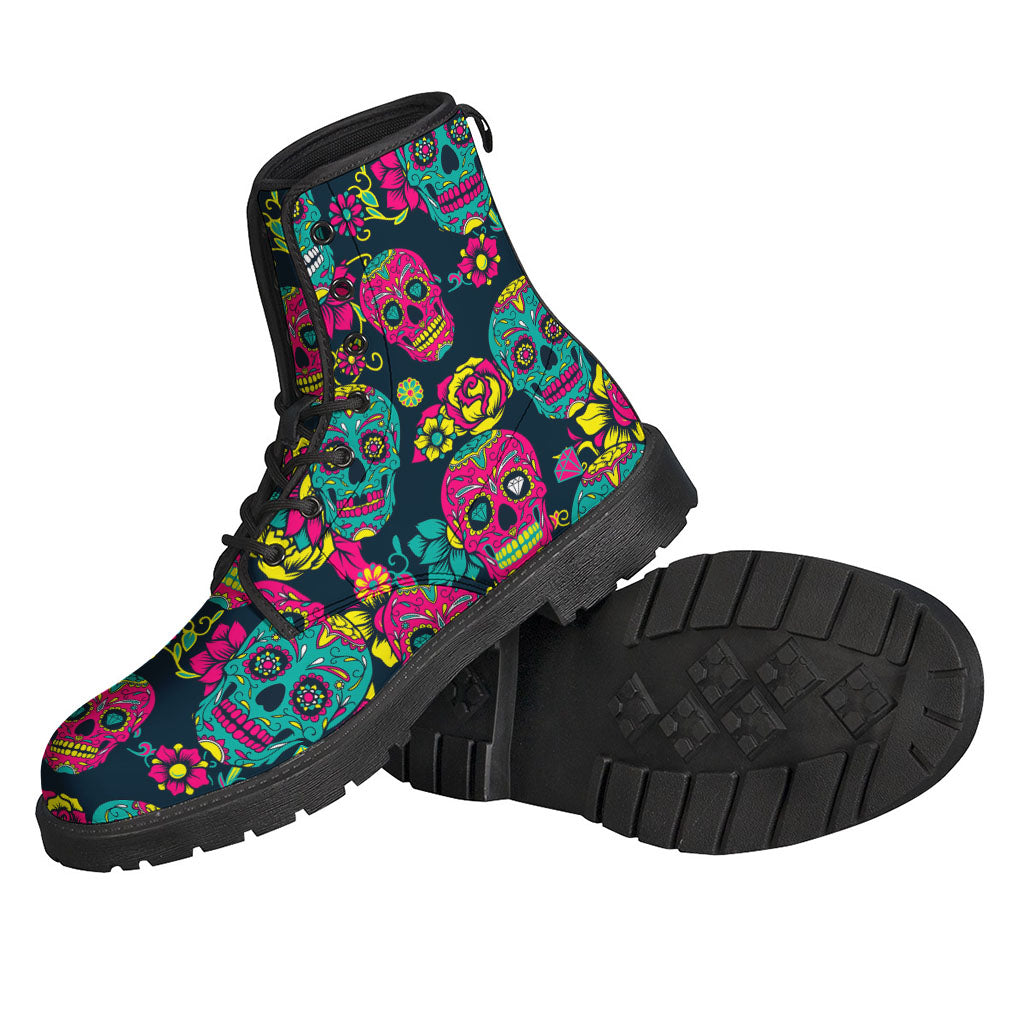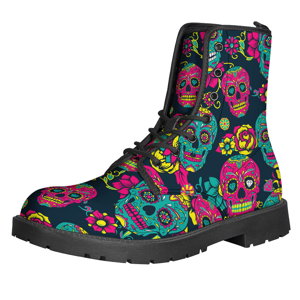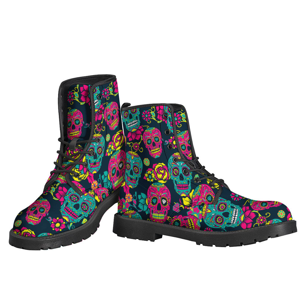 Embrace your inner free spirit with these one-of-a-kind Teal Pink Sugar Skull Pattern Leather Boots. Perfect for any modern-day hippie looking to add a touch of bohemian flair to their outfit. Made from lightweight leather, these boots are comfortable to wear for all-day adventures. The vibrant teal and pink sugar skull pattern adds a fun and eclectic charm to your look. Pair them with your favorite flowy dress or bell-bottoms for a complete hippie-chic ensemble. Stand out from the crowd with these unique and stylish boots that speak to your carefree and adventurous spirit.