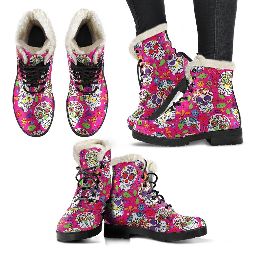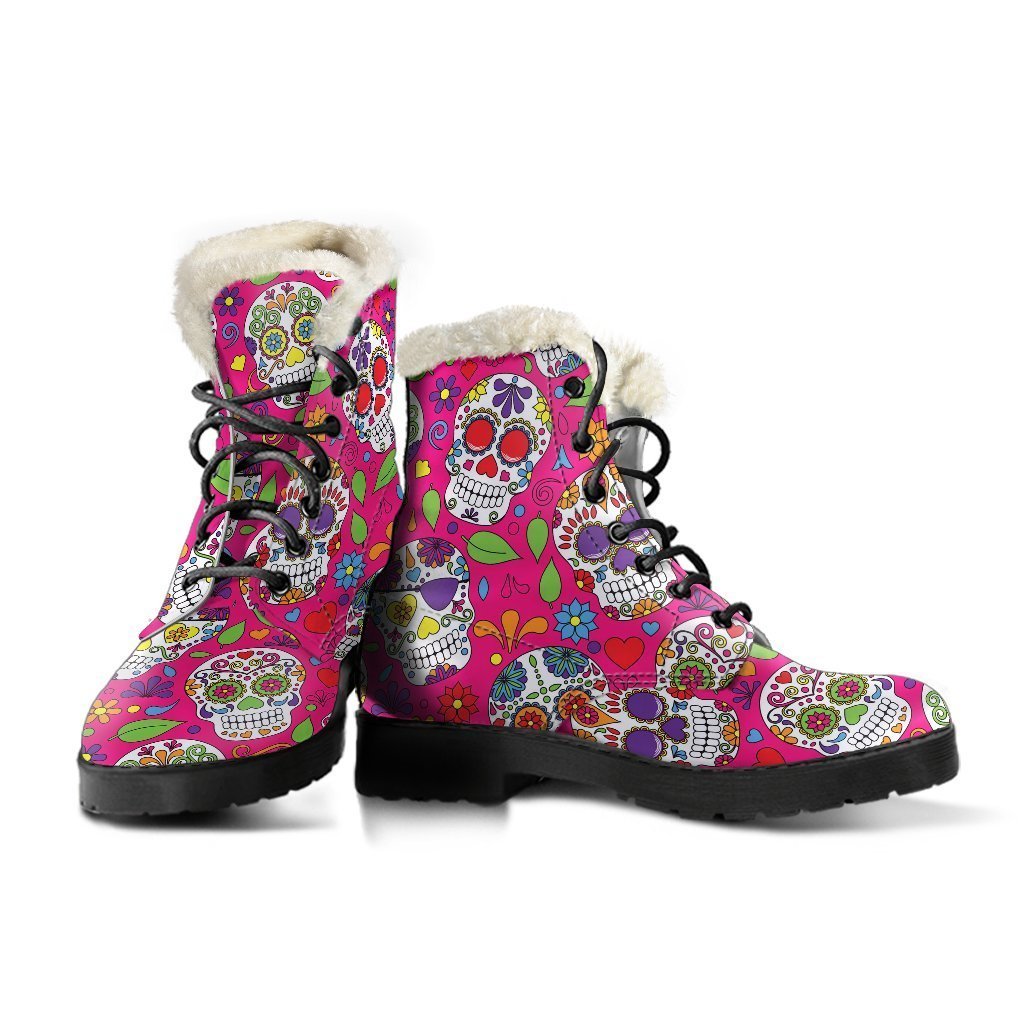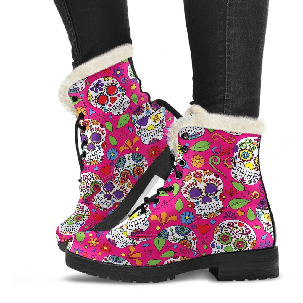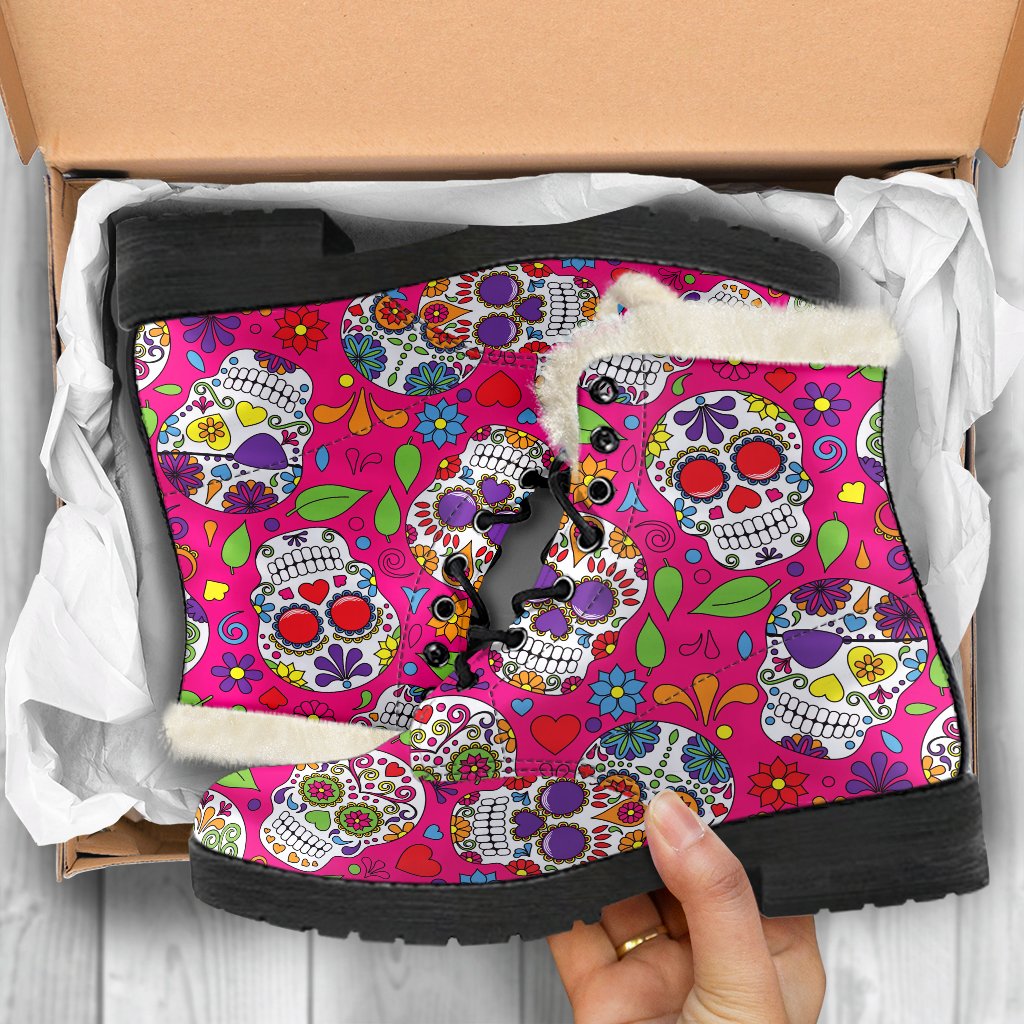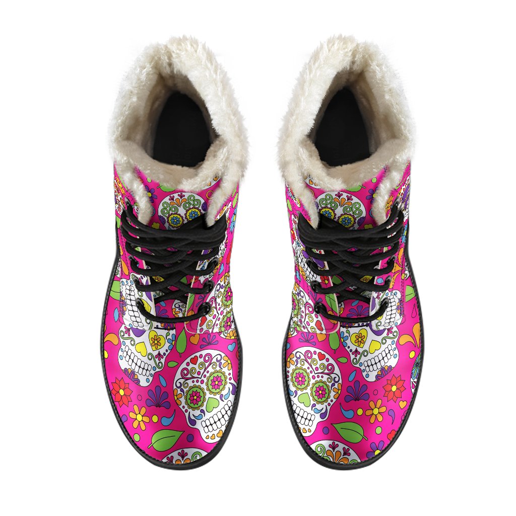 Pink Sugar Skull Pattern Faux Fur Leather Boots for Groovy Hippies