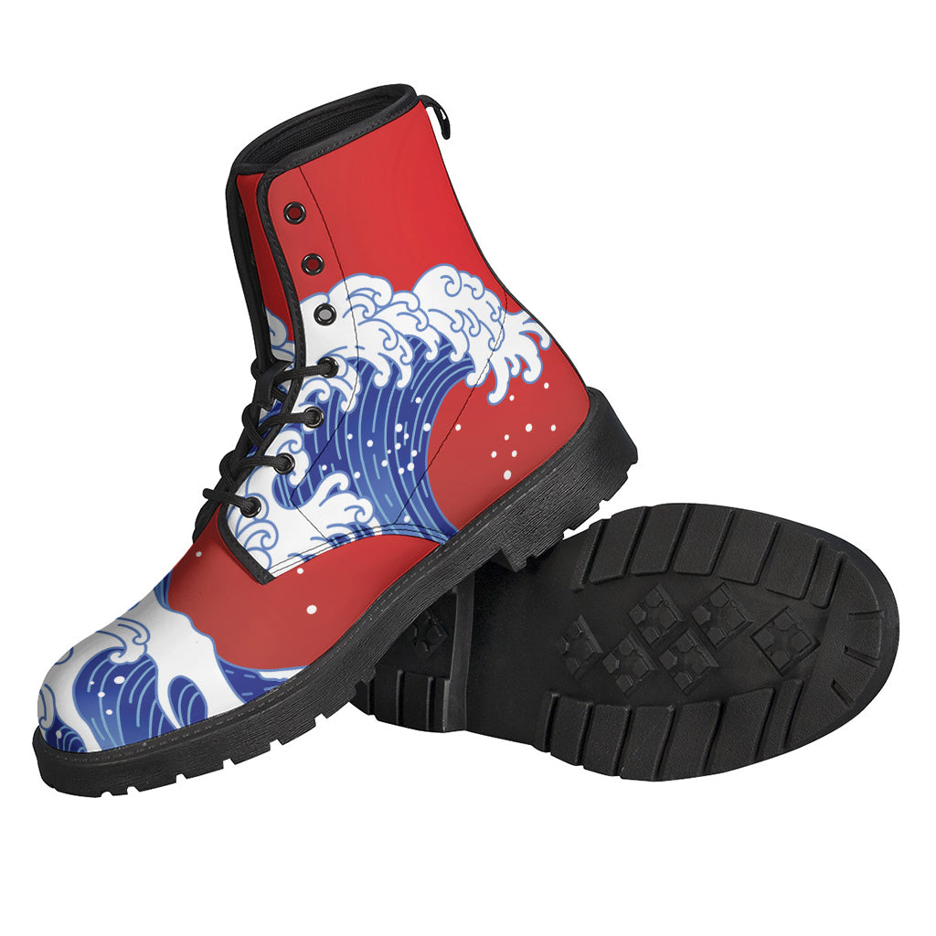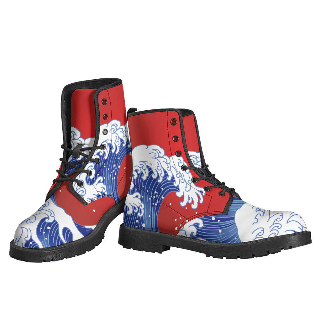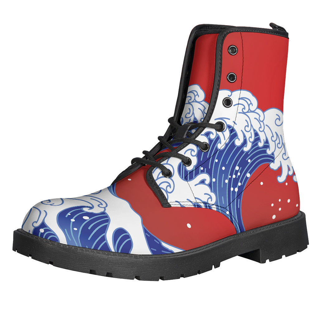 These Japanese wave print Leather Lightweight Boots are the perfect choice for hippies looking to add a touch of style and personality to their wardrobe. Made from high-quality leather, these boots are not only durable and comfortable but also feature a vibrant red sun and Japanese wave print design that is sure to make a statement. The lightweight construction makes them easy to wear all day long, whether you're heading to a music festival, exploring the great outdoors, or simply hanging out with friends. Add a touch of bohemian flair to your look with these unique and stylish hippie boots.
