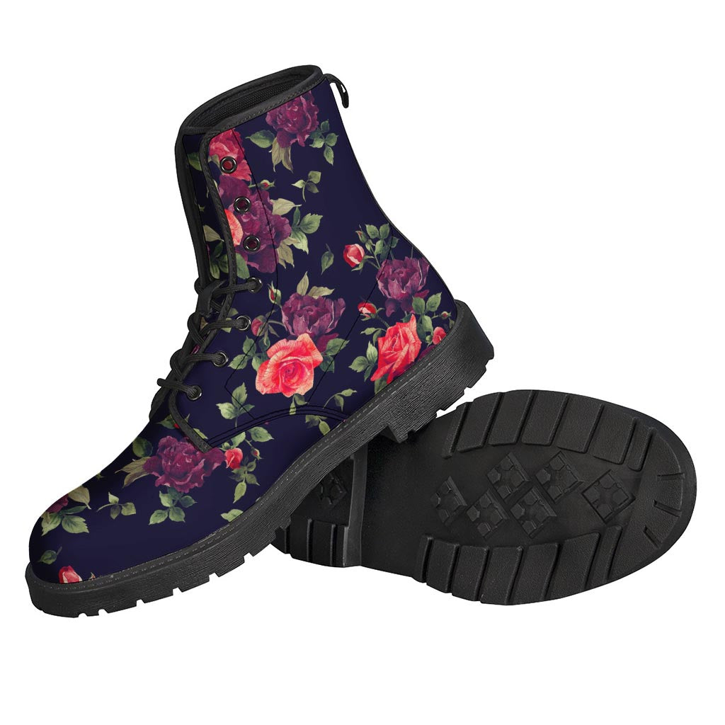 Red Violet Roses Floral Pattern Print Leather Boots for Hippy Fashion Enthusiasts