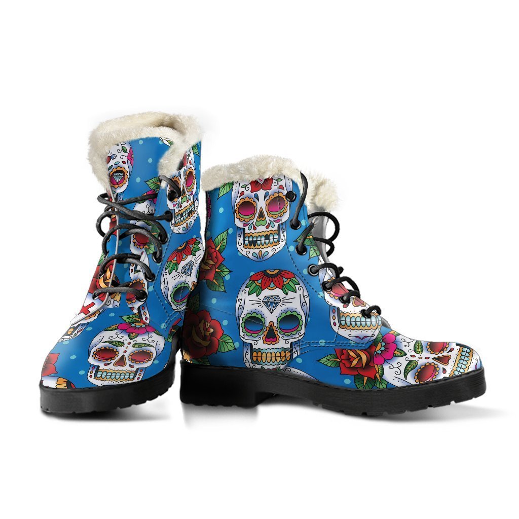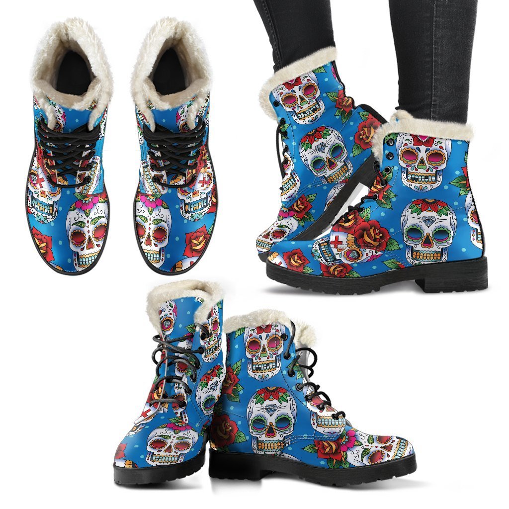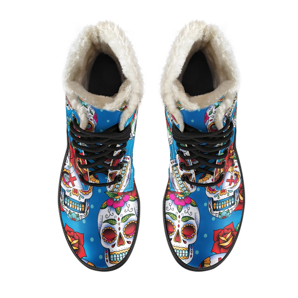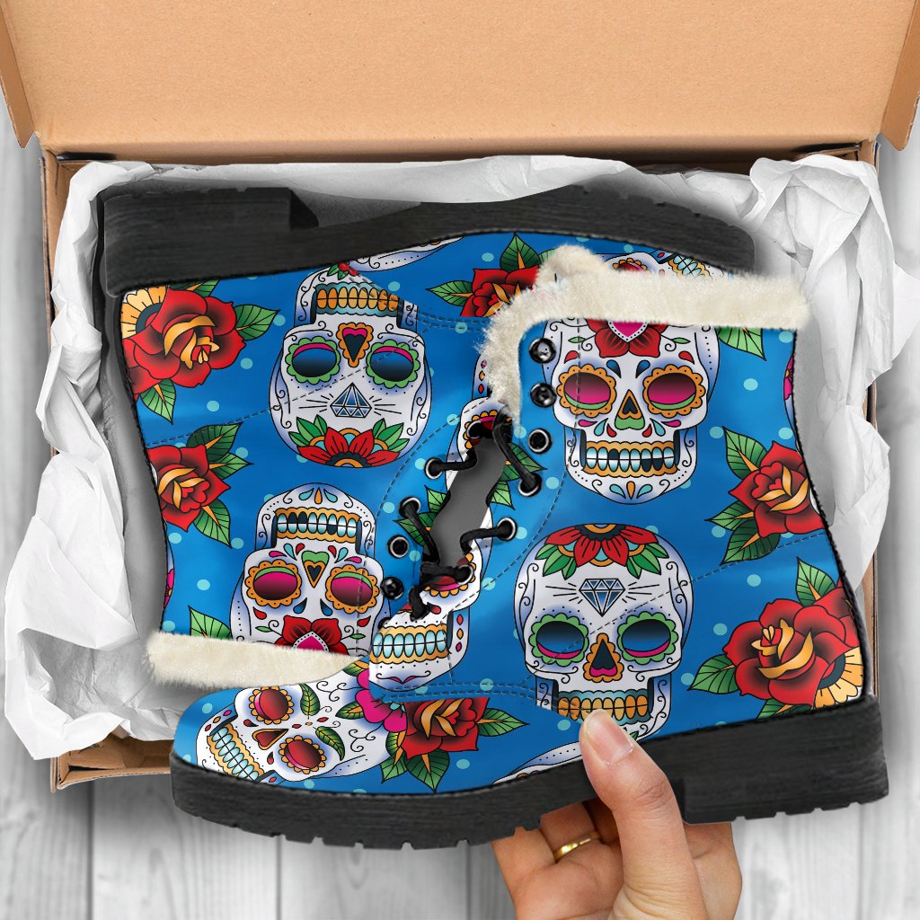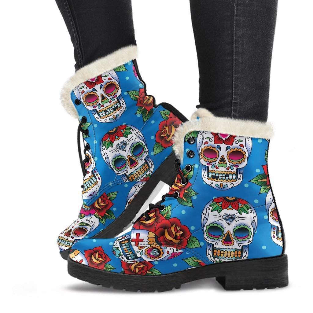 Emerald Blossoms - Rose Sugar Skull Faux Fur Leather Boots for Hippie Souls