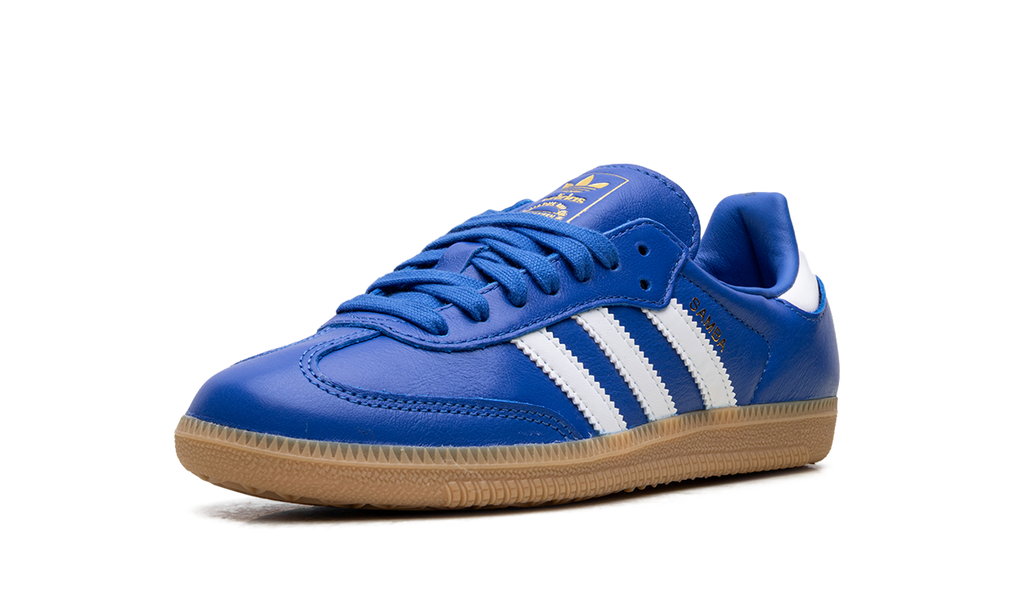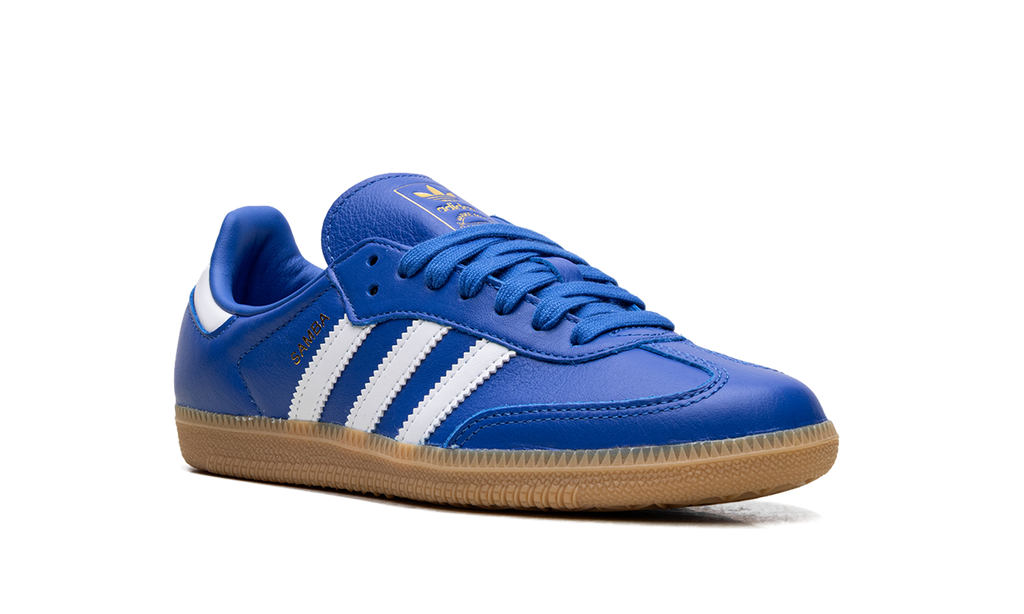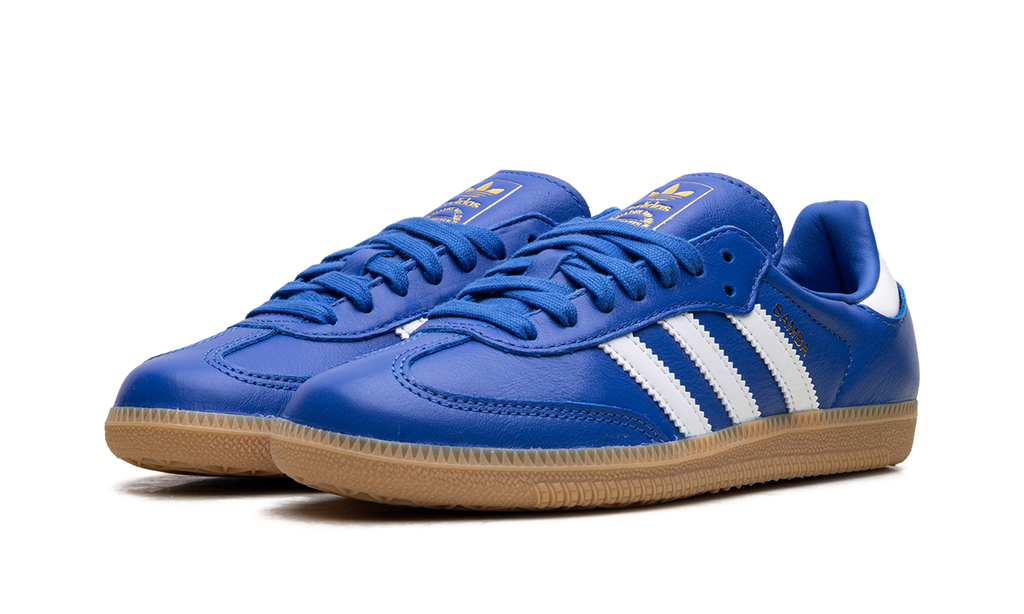 The Adidas Samba "Blue / Cloud White" offers a clean, classic iteration of the iconic indoor soccer shoe. The shoe features a rich blue upper contrasted by the signature "Cloud White" on the three-stripes branding and heel tab. It maintains the Samba's traditional design elements, including a low-profile silhouette and the distinctive gum rubber outsole for traction and vintage appeal. This colorway provides a fresh, versatile look for a timeless sneaker.