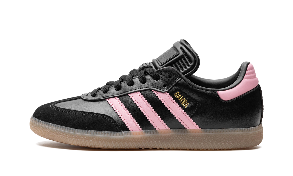The adidas Samba OG “Inter Miami - Black” is a colorway of the popular retro shoe inspired by the Major League Soccer team. Also said to be inspired by Inter Miami’s star player, football (soccer) legend Lionel Messi, the “Inter Miami” features the colors of the Miami-based team on its design. The upper has a black leather construction with pink leather Three Stripes branding. A gold “Samba” logo appears on the lateral side of the mid-panel, while detailing inspired by Inter Miami is located on the tongue. A semi-translucent, smoky Gum rubber sole completes the look.