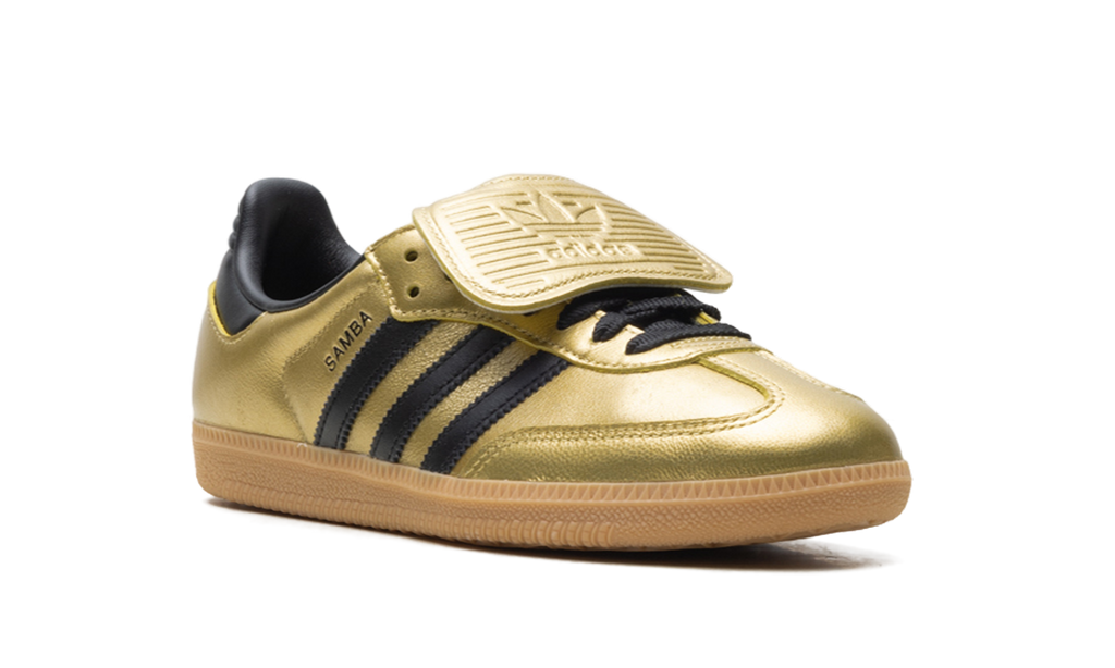 Lace up a true classic with the adidas Samba LT Wmns "Gold Metallic/Black/Gum," a sophisticated take on the iconic indoor soccer sneaker. This standout women's shoe features a head-turning metallic leather upper with contrasting Core Black accents and a classic T-toe. Honoring its football roots, it sports the signature oversized fold-over tongue. A durable gum rubber outsole provides reliable traction and a timeless, vintage aesthetic, making this regular-fit Samba LT a bold, stylish staple for your everyday wardrobe.