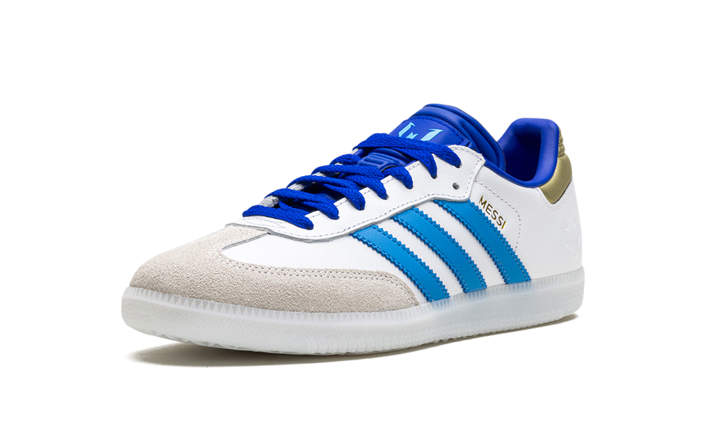 The Lionel Messi x adidas Samba Indoor "Argentina" is a collaboration between the soccer icon and adidas on the classic indoor soccer shoe. The adidas Samba “Argentina” is inspired by both the legendary soccer—or football, depending on where in the world you are—player and his home country. More specifically, the shoe is heavily inspired by the World Cup Trophy Messi won during the 2022 Qatar FIFA World Cup. The upper features a white leather base with two shades of blue inspired by Argentina’s kits (uniforms) in the aforementioned World Cup. Gold “Messi” branding appears on the lateral side by the blue Three Stripes and on the heel. An icy blue translucent rubber sole completes the look. Release date: February 20, 2024