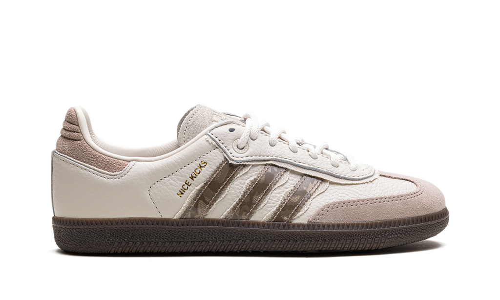 The Nice Kicks x adidas Samba "Consortium Cup" is a collaboration between the sneaker media company and adidas on a colorway of the retro sneaker made with premium materials and a keen attention to detail. Nice Kicks’ adidas Samba is one of several colorways of the Samba from the “Consortium Cup” of collaborations, which also includes colorways by Sneaker Politics, Footpatrol, and Extra Butter. As for the shoe at hand, the upper features a white tumbled leather construction with tan suede overlays on the toe and heel. The Three Stripes branding on either side of the shoe has frayed edges, and a gold “Nice Kicks” logo appears on the lateral side of the mid-panel. Dual branding can be found on the tongue and insole. An adidas Consortium hangtag completes the look. Release date: November 15, 2023