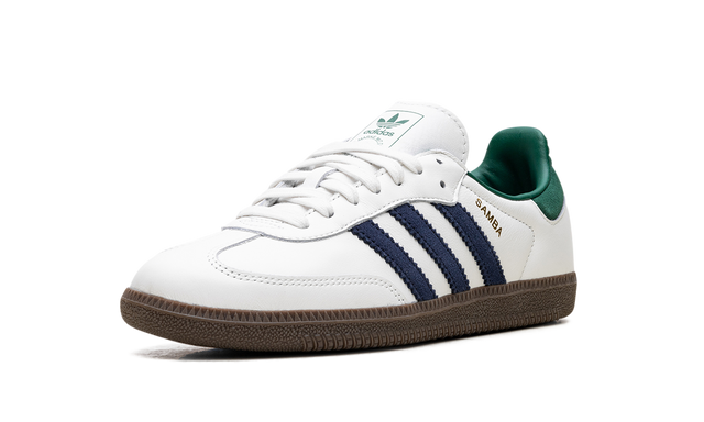 The "Black White Collegiate Green" version retains the classic Samba features with a premium leather upper, suede details and a traditional gum rubber sole. The Core Black/Cloud White/Collegiate Green colorway offers a modern look that stays true to the shoe's heritage.