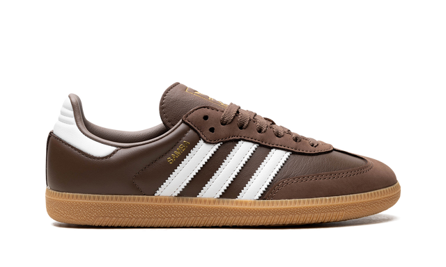 The adidas Samba OG Earth Strata Gum (W) elevates a classic with a rich, earthy palette. Smooth calf leather meets suede overlays, blending luxury with iconic design. Earth Strata dominates, coloring laces, tongue, and insole for a cohesive look. Footwear White serrated stripes and heel tab provide sharp contrast, while gold metallic accents add elegance. A gum rubber outsole ensures grip and heritage appeal. This sneaker, inspired by indoor soccer, delivers comfort and durability with a sleek, retro aesthetic. Ideal for those seeking standout style and timeless functionality.
