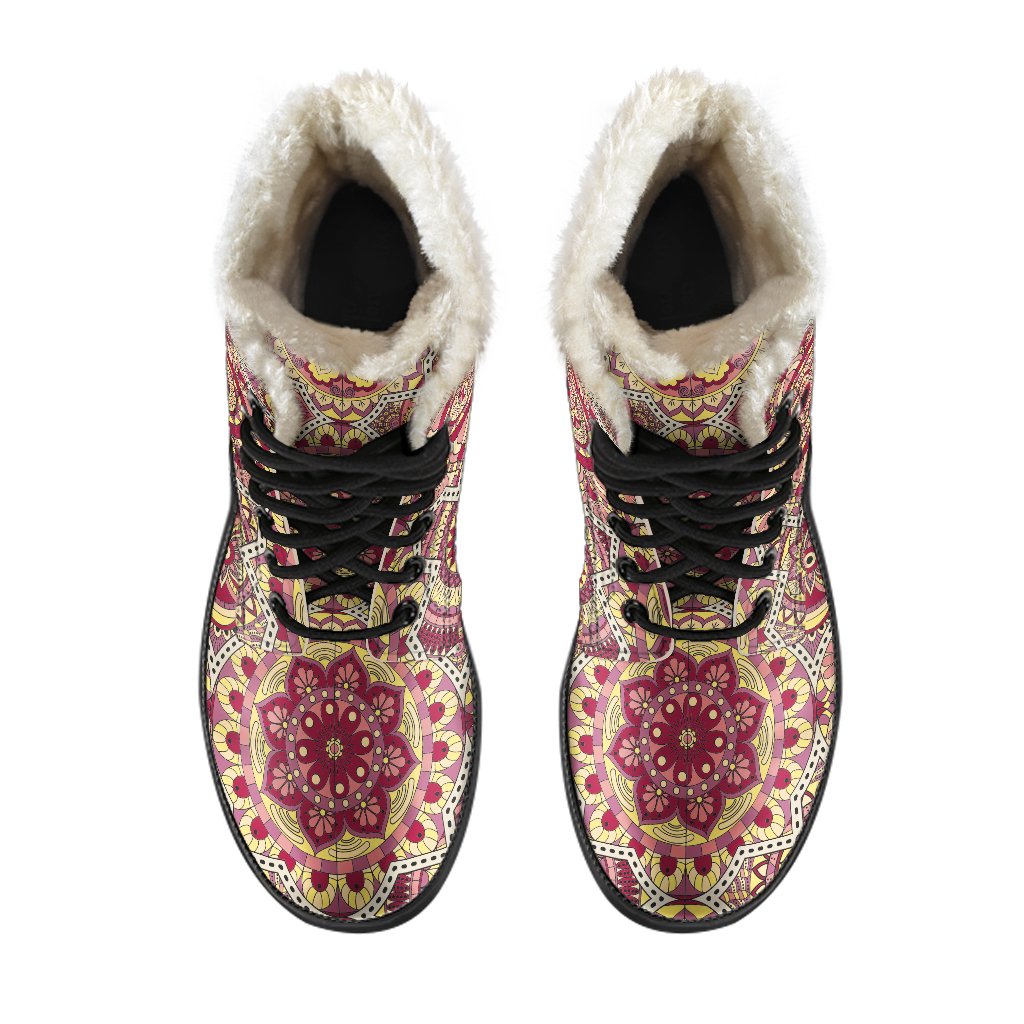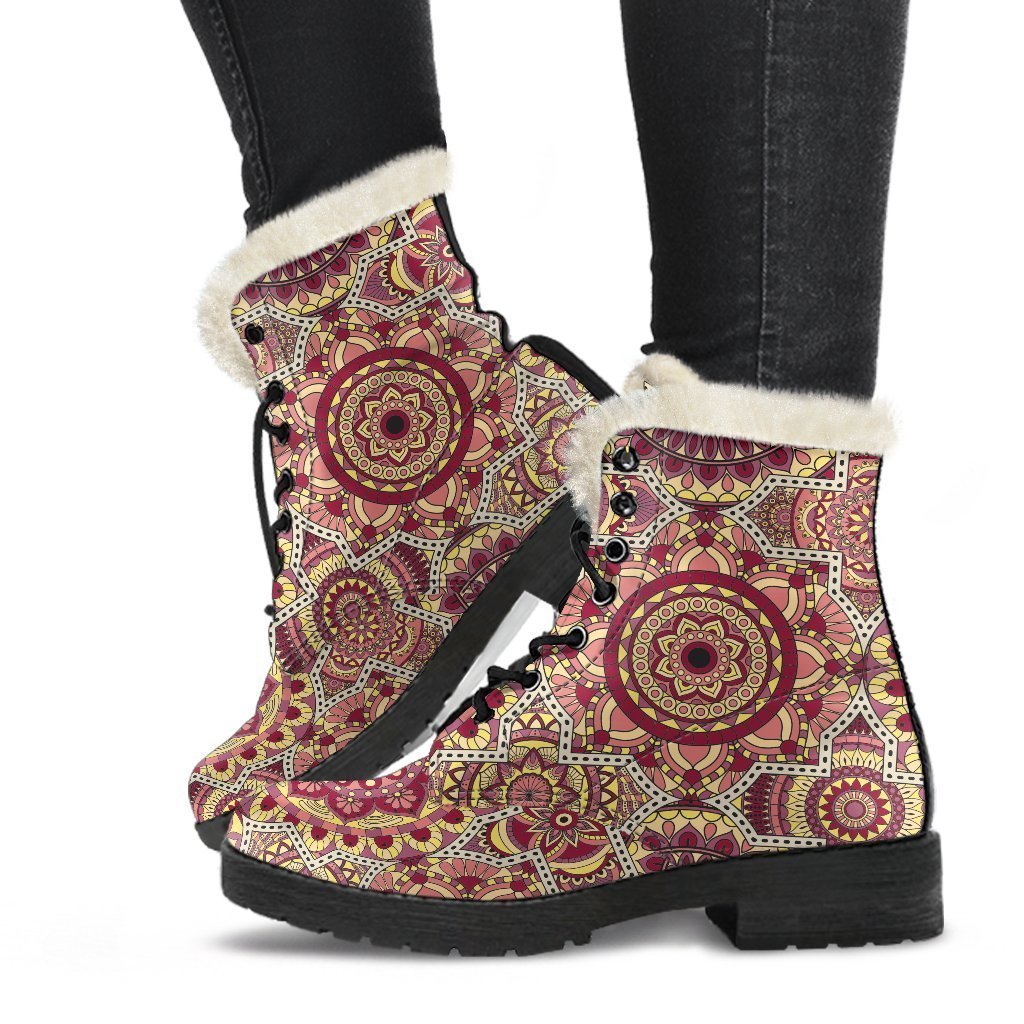 Embrace your inner free-spirit with these Sangria Mandala Bohemian Pattern Print Faux Fur Leather Boots. These stylish boots feature a vibrant mandala design that exudes bohemian vibes, perfect for any hippie at heart. The faux fur lining adds a touch of warmth and coziness, making these boots both fashionable and functional. Whether you're heading to a music festival or simply want to add a touch of boho-chic to your everyday look, these boots are sure to make a statement. Step out in style and channel your inner hippie with these unique and eye-catching boots.