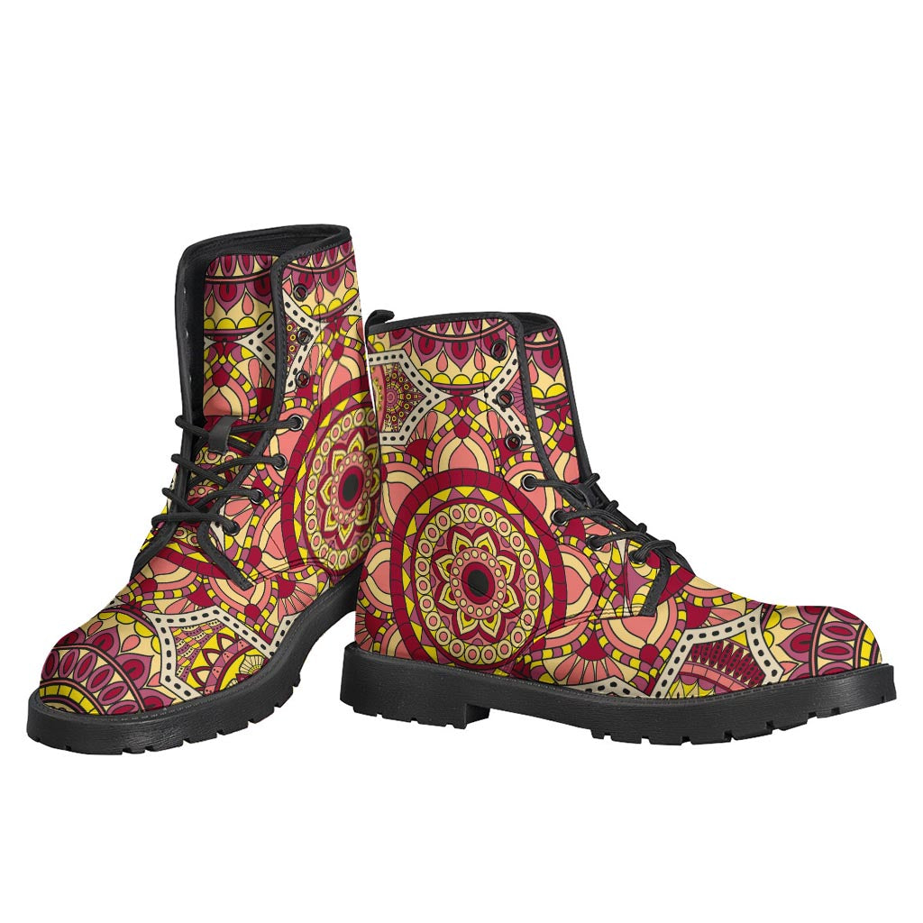 These vibrant and eye-catching Sangria Mandala Bohemian Pattern Print Leather Boots are perfect for the free-spirited hippie at heart. Made from high-quality leather, these lightweight boots feature a unique mandala print in shades of sangria red, purple, and blue. The intricate design adds a touch of bohemian flair to any outfit, while the durable construction ensures long-lasting wear. With a comfortable fit and a stylish aesthetic, these boots are the perfect choice for those who want to express their individuality and embrace their inner hippie spirit. Step out in style with these one-of-a-kind hippie-inspired boots that are sure to turn heads wherever you go.