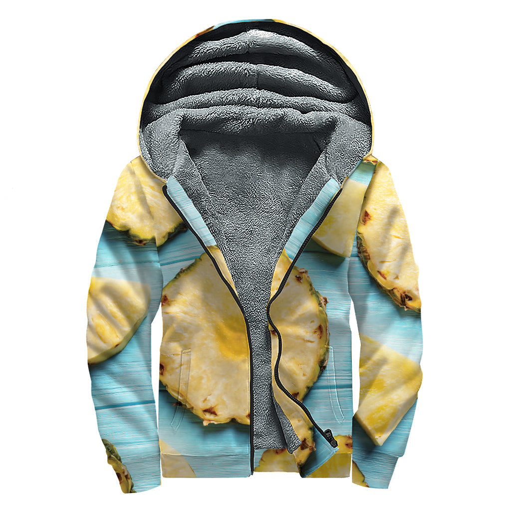 This Sherpa Lined Zip Up Hoodie is the perfect addition to any hippie's wardrobe. With a vibrant sliced pineapple print on the outside, this hoodie brings a fun and tropical-inspired touch to your look. The cozy Sherpa lining provides warmth and comfort, making it ideal for chilly days and nights. Whether you're heading to a music festival, going on a nature hike, or simply want to add a playful pop of color to your outfit, this hoodie is a must-have for any free-spirited individual. Embrace your inner hippie and stay warm in style with this trendy Sherpa Lined Zip Up Hoodie.