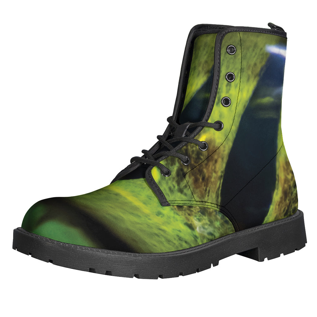 The Hippies Leather Lightweight Boots are a stylish and unique footwear choice for those who embrace the Hippie fashion aesthetic. Made from high-quality leather, these boots feature a green snake eye print design that adds a bold and eye-catching touch to any outfit. With a lightweight construction, these boots are comfortable to wear all day long, making them perfect for festivals, concerts, or everyday wear. The versatile design of these boots allows them to be dressed up or down, making them a versatile addition to any wardrobe. Whether you're a full-time Hippie or just looking to add a touch of bohemian flair to your look, these Leather Lightweight Boots are sure to make a statement.
