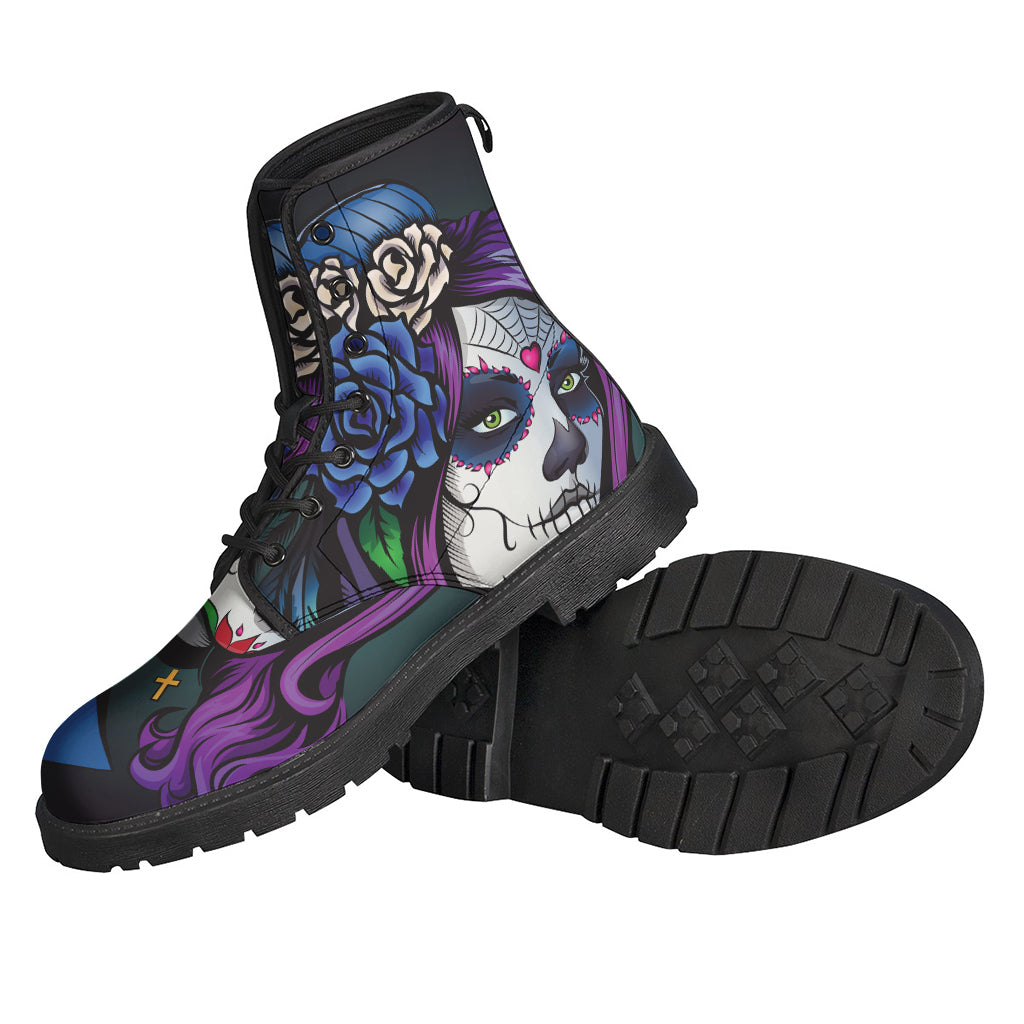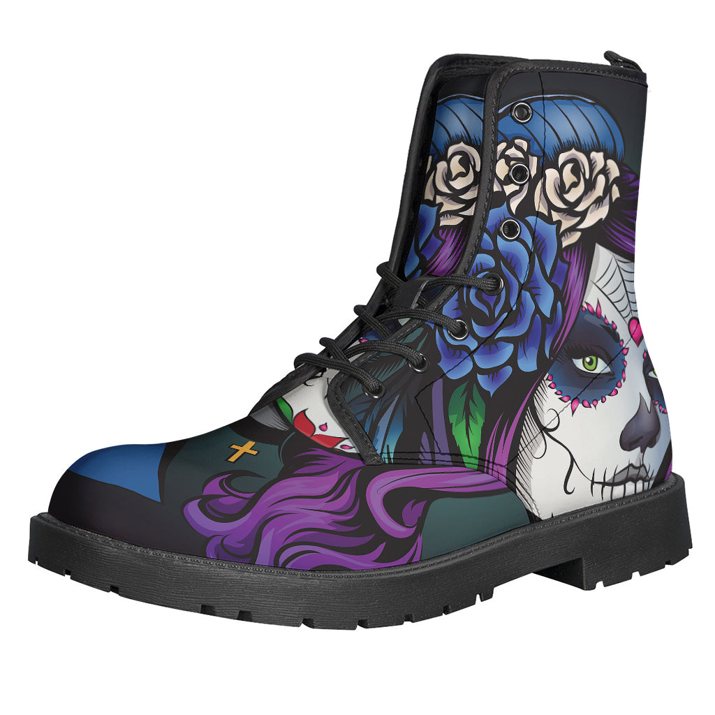 Get ready to channel your inner hippie with these Calavera Girl Dia de los Muertos print leather boots! Made for those who love to embrace their unique style, these lightweight boots are perfect for adding a pop of color and personality to any outfit. The vibrant Dia de los Muertos print on these boots is sure to make a statement wherever you go. Whether you're hitting up a music festival or just wandering the streets, these boots will keep you comfortable and looking effortlessly cool. Embrace the hippie spirit and stand out from the crowd with these one-of-a-kind leather boots.