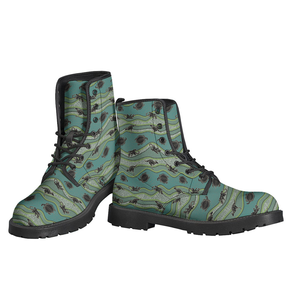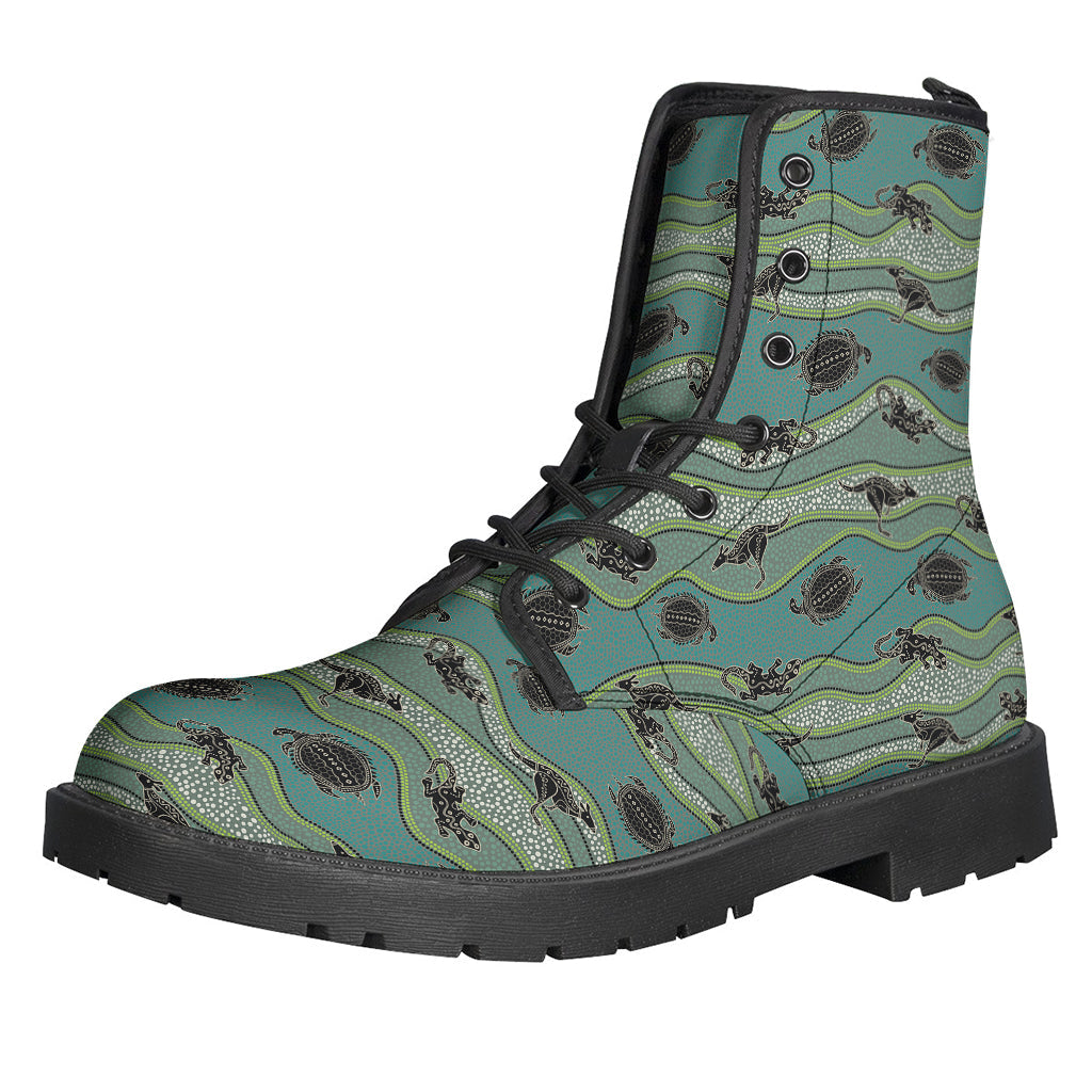 Embrace your inner free spirit with these Hippies Leather Lightweight Boots featuring an Aboriginal animals pattern print. Made with high-quality leather, these boots are not only stylish but also durable and comfortable for all-day wear. The lightweight design makes them perfect for festivals, concerts, or everyday adventures. The unique print adds a touch of bohemian flair to any outfit, making them a must-have for any hippie at heart. Step out in style and make a statement with these eye-catching boots that will have heads turning wherever you go.