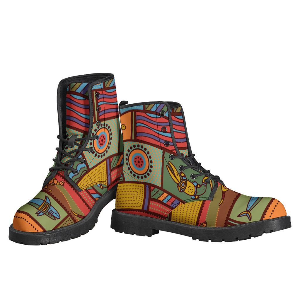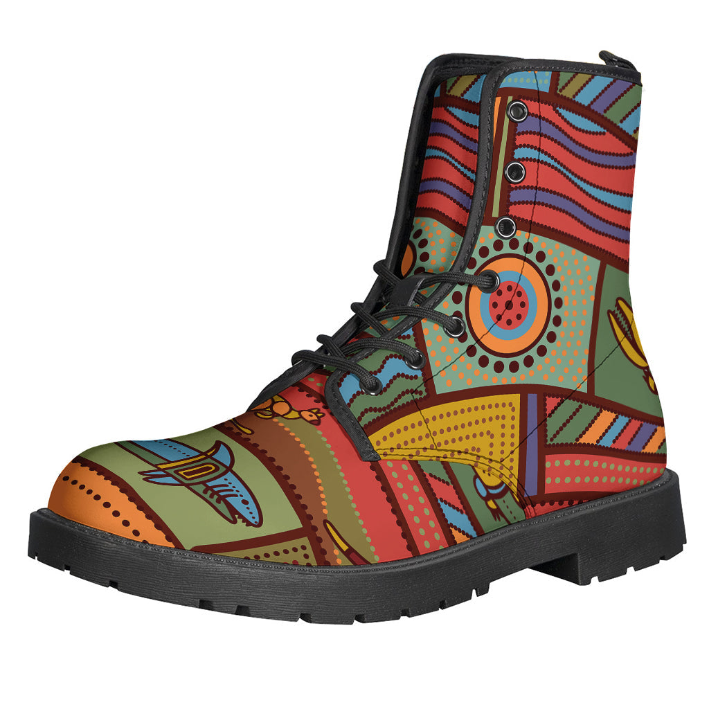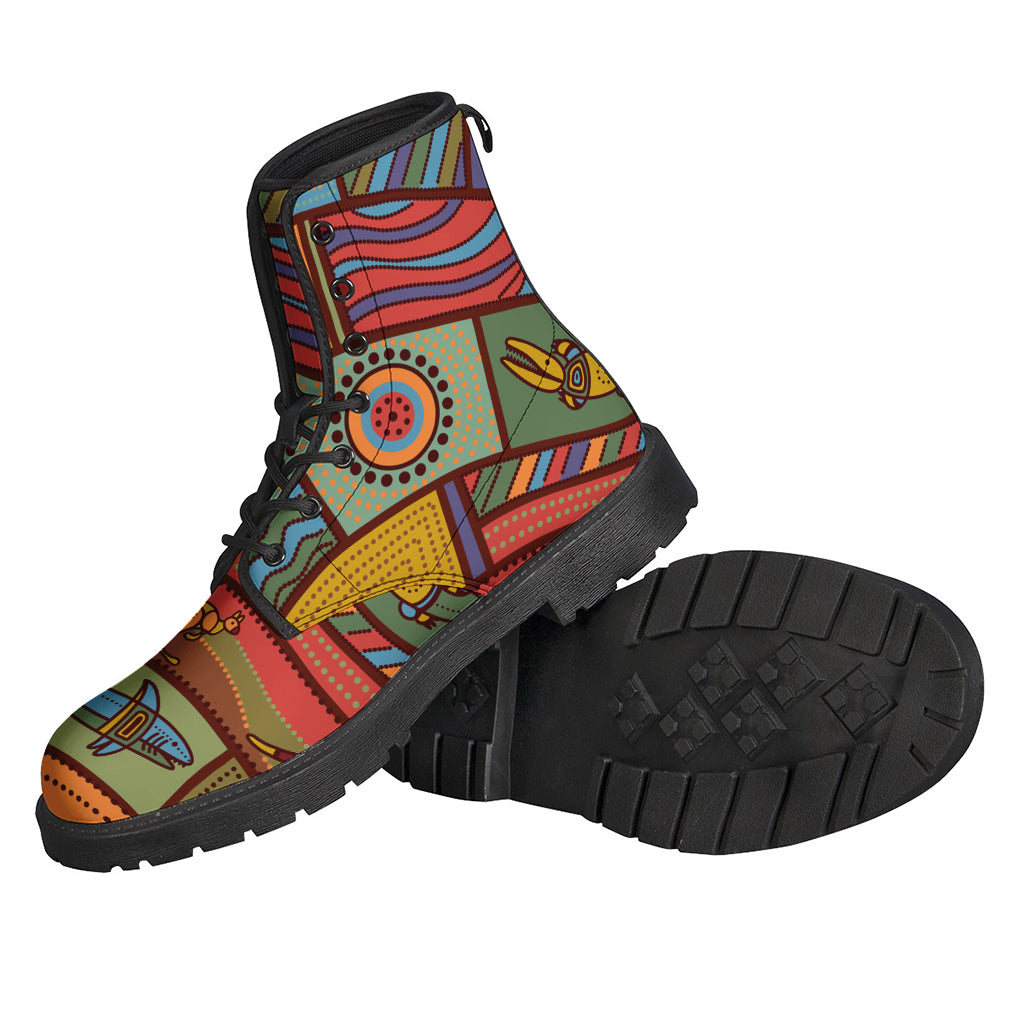 Step out in style with these vibrant and unique hippie Leather Lightweight Boots from Gear Frost. These Australian Ethnic Pattern Print Leather Boots are perfect for the free-spirited individual who loves to express themselves through their fashion choices. The colorful and intricate ethnic pattern print on these boots adds a bohemian touch to any outfit. Made from high-quality leather, these boots are not only stylish but also long-lasting and comfortable. Whether you're heading to a music festival or just want to add a touch of hippie flair to your everyday look, these boots are sure to turn heads. Embrace your inner hippie with these one-of-a-kind Leather Lightweight Boots.