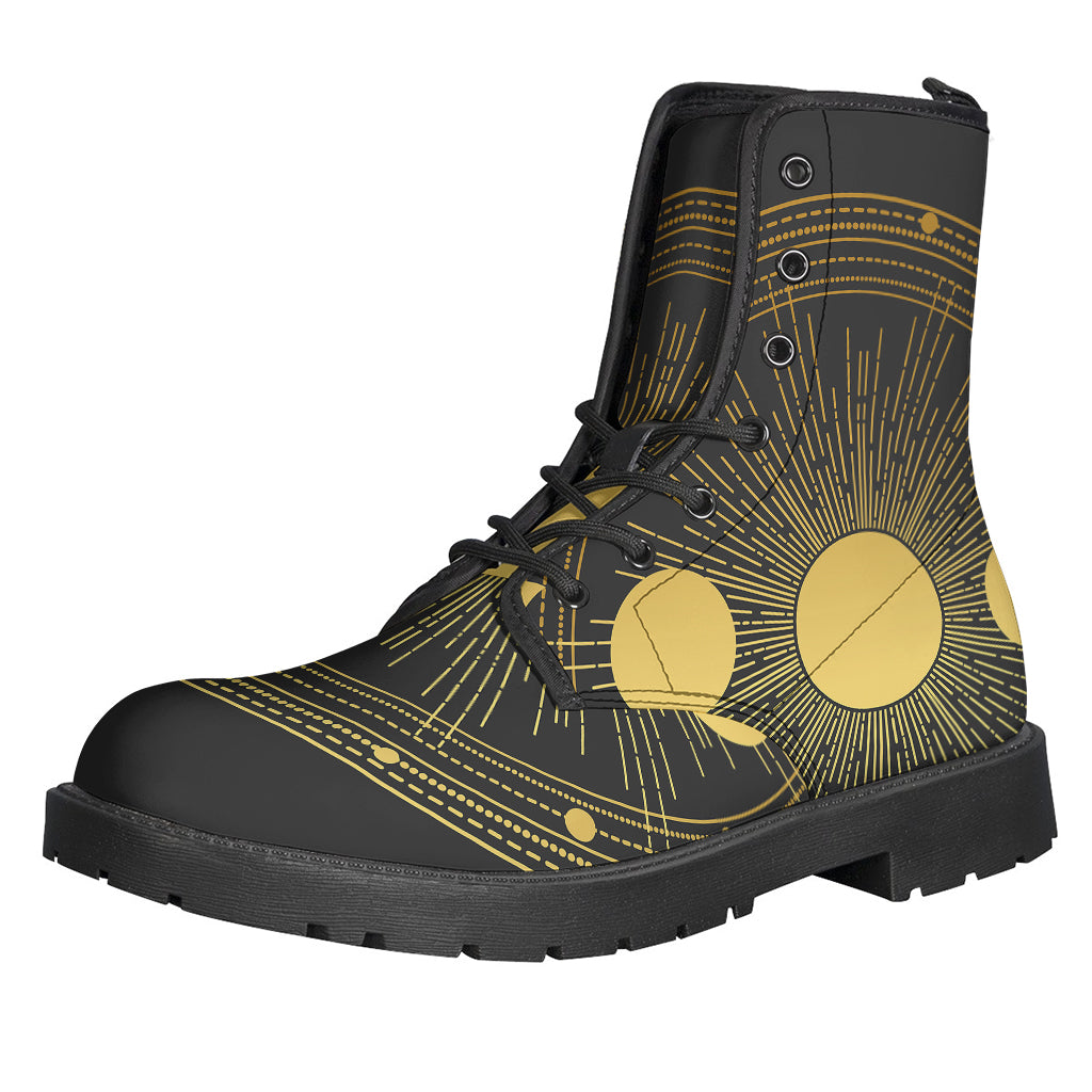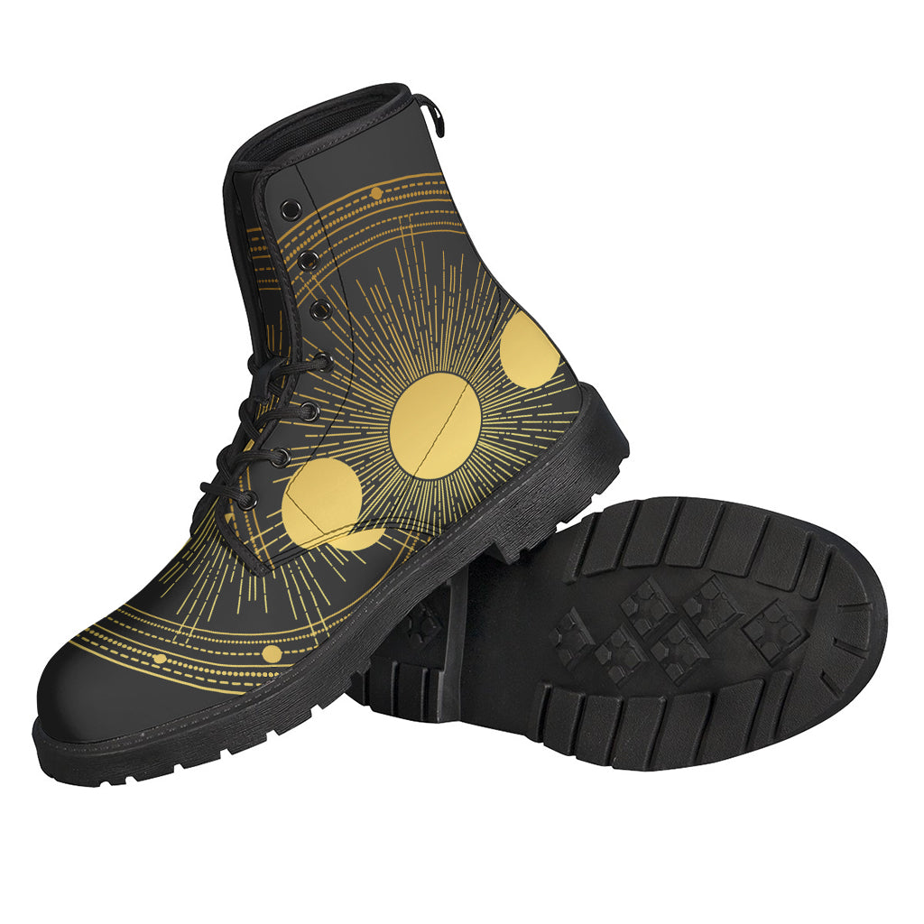 These Hippies Leather Lightweight Boots are perfect for those who want to express their free-spirited and bohemian style. The boots feature a unique sun and moon phase print on the leather, adding a touch of whimsy and magic to any outfit. The lightweight design makes them comfortable for all-day wear, while the durable leather construction ensures they will last for years to come. Whether you're heading to a music festival or just love to add a touch of hippie flair to your everyday look, these boots are sure to become a staple in your wardrobe. Available in a variety of sizes, these boots are a must-have for any hippie fashion lover.