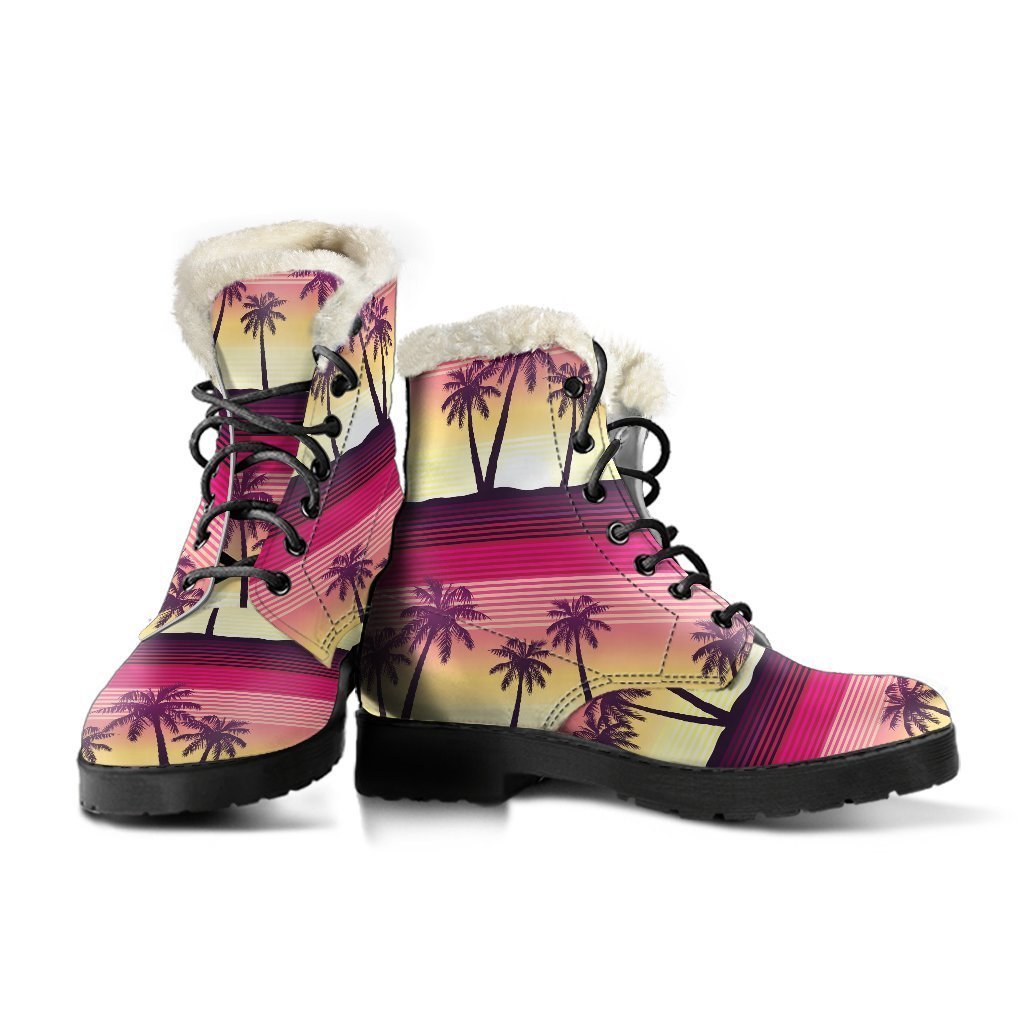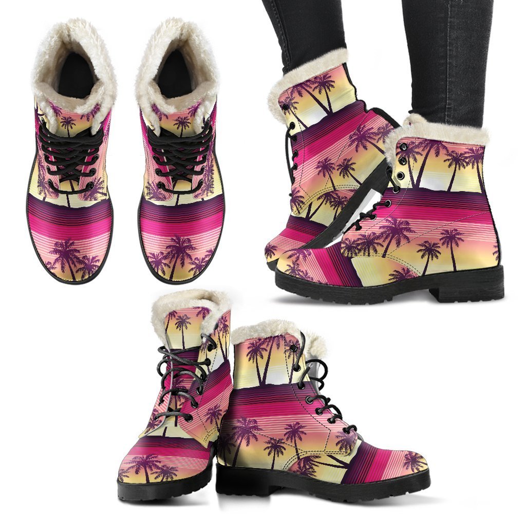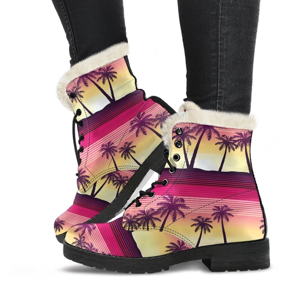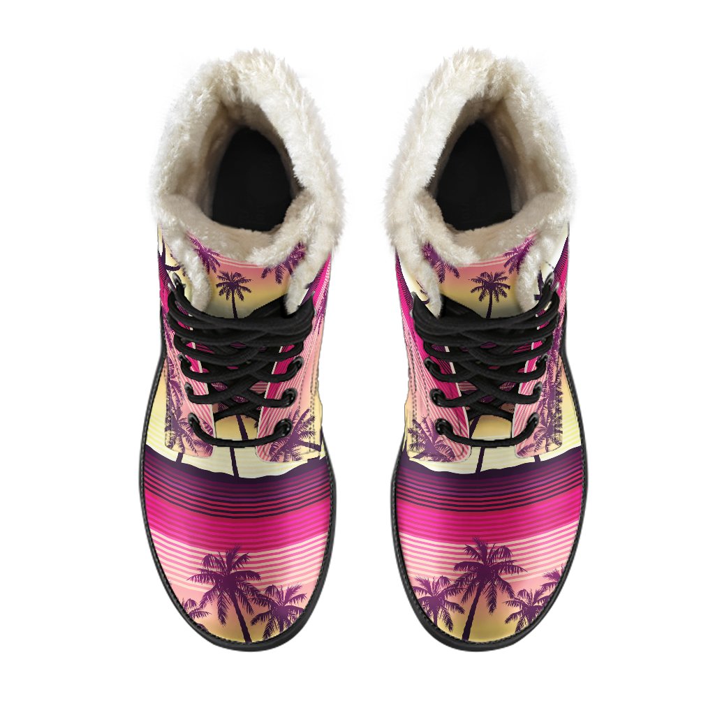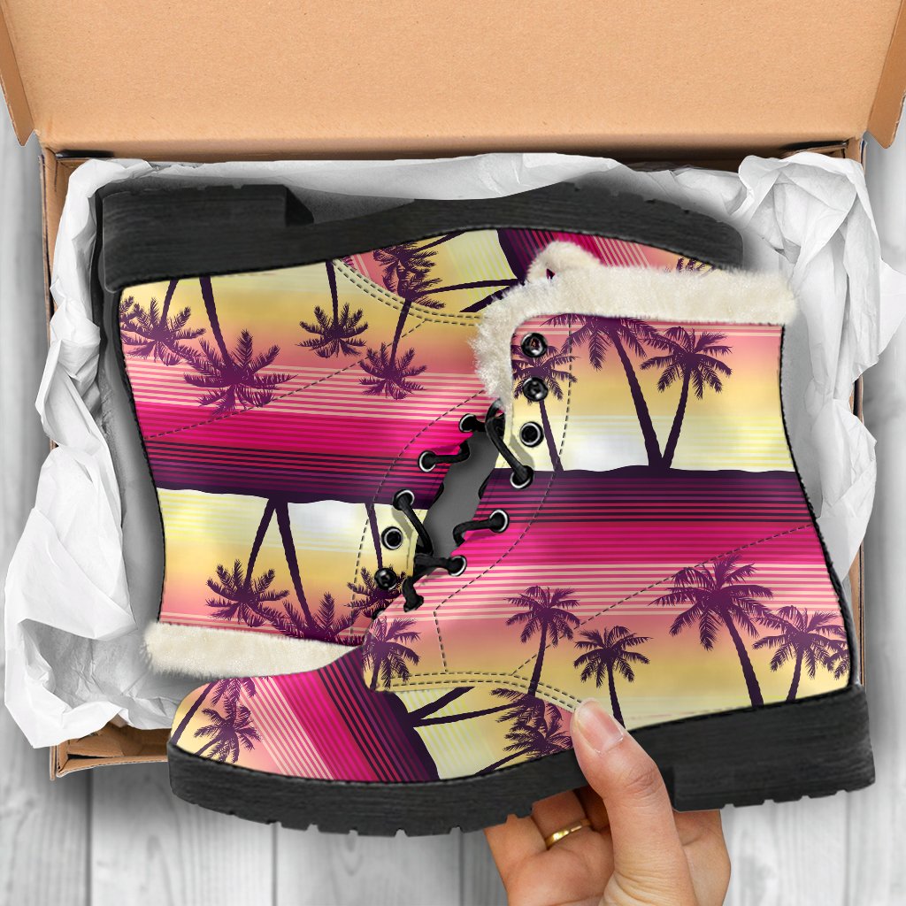 Sunset Palm Tree Pattern Faux Fur Leather Boots for the Free-Spirited Hippie
