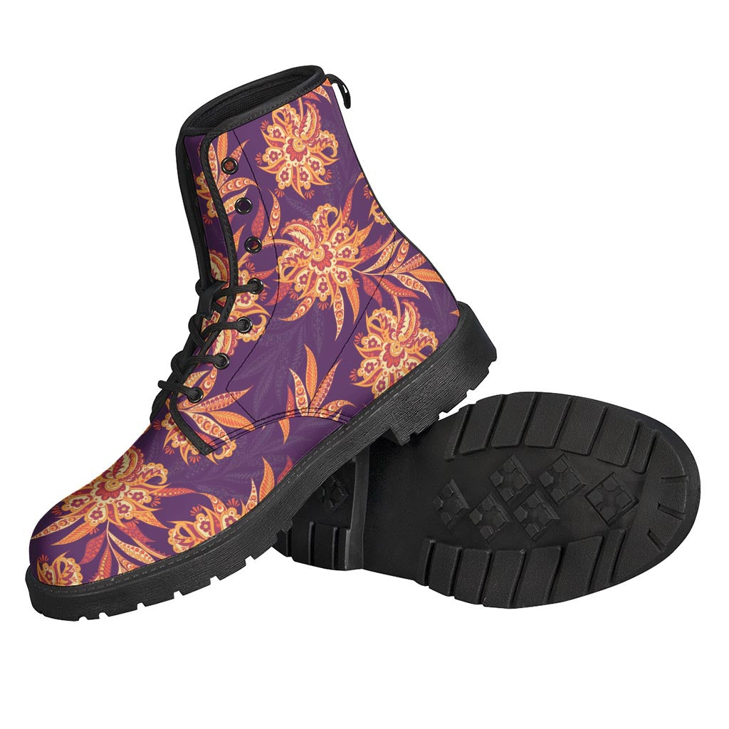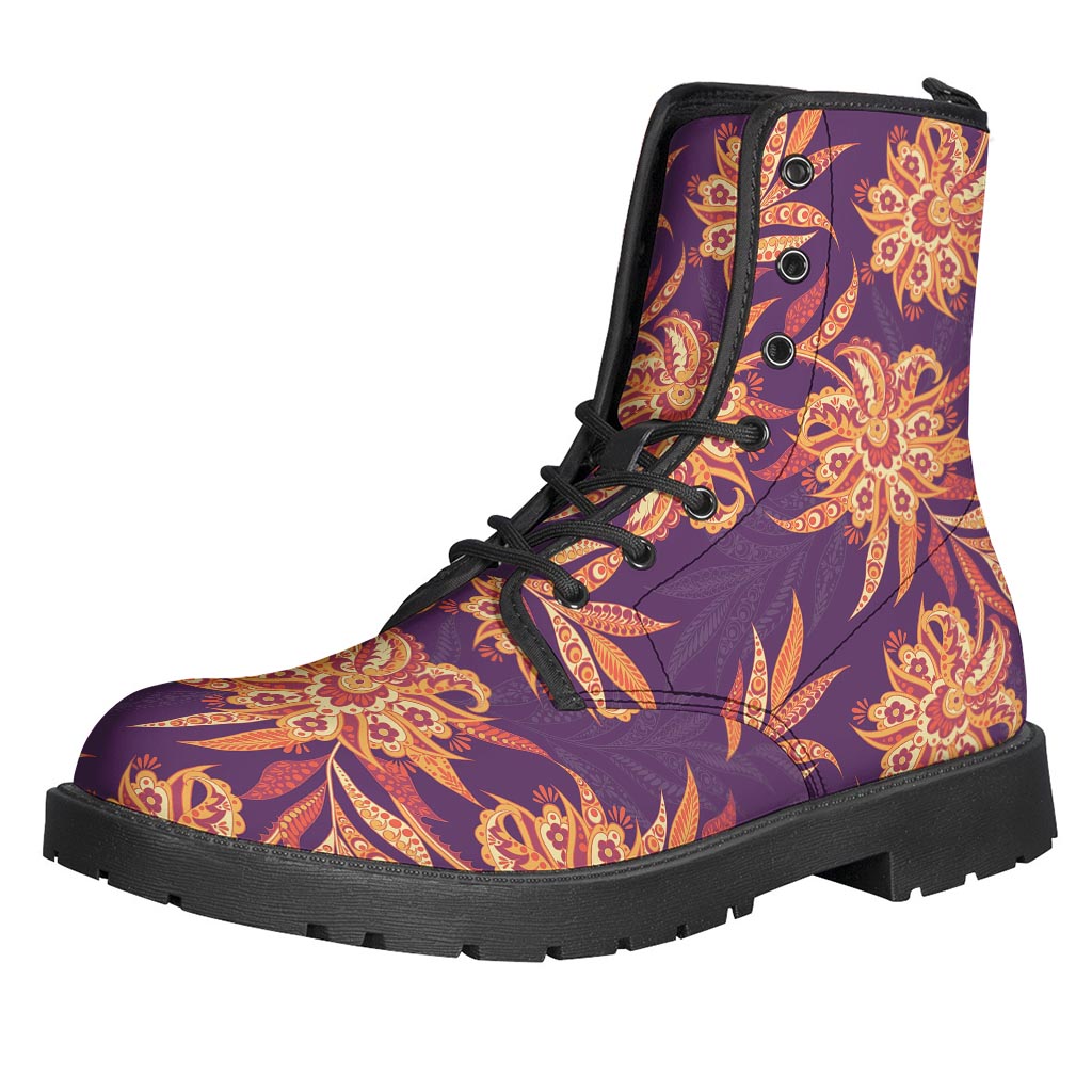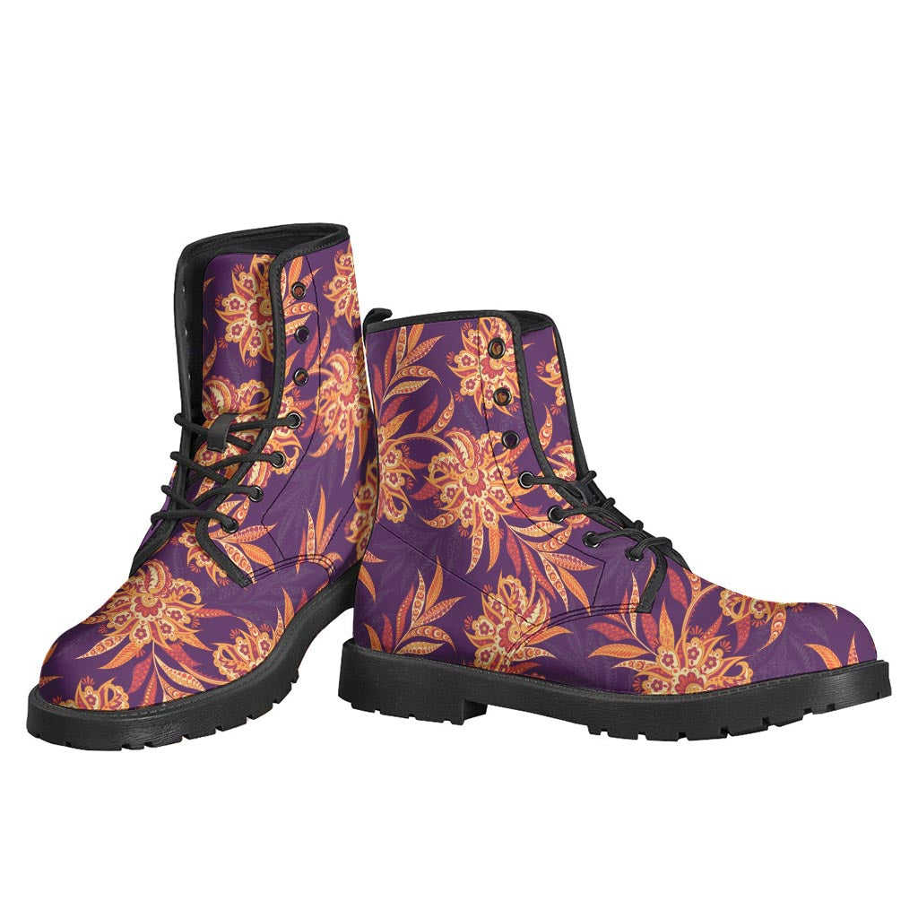 Embrace your inner bohemian spirit with these vibrant Tangerine Floral Leather Lightweight Boots. These boots feature a bold and colorful bohemian pattern print that adds a pop of personality to any outfit. The high-quality leather construction ensures durability and comfort, making them perfect for long days of festival hopping or everyday wear. Step out in style and make a statement with these unique and eye-catching hippie-inspired boots.