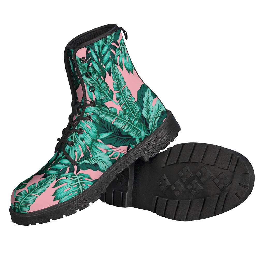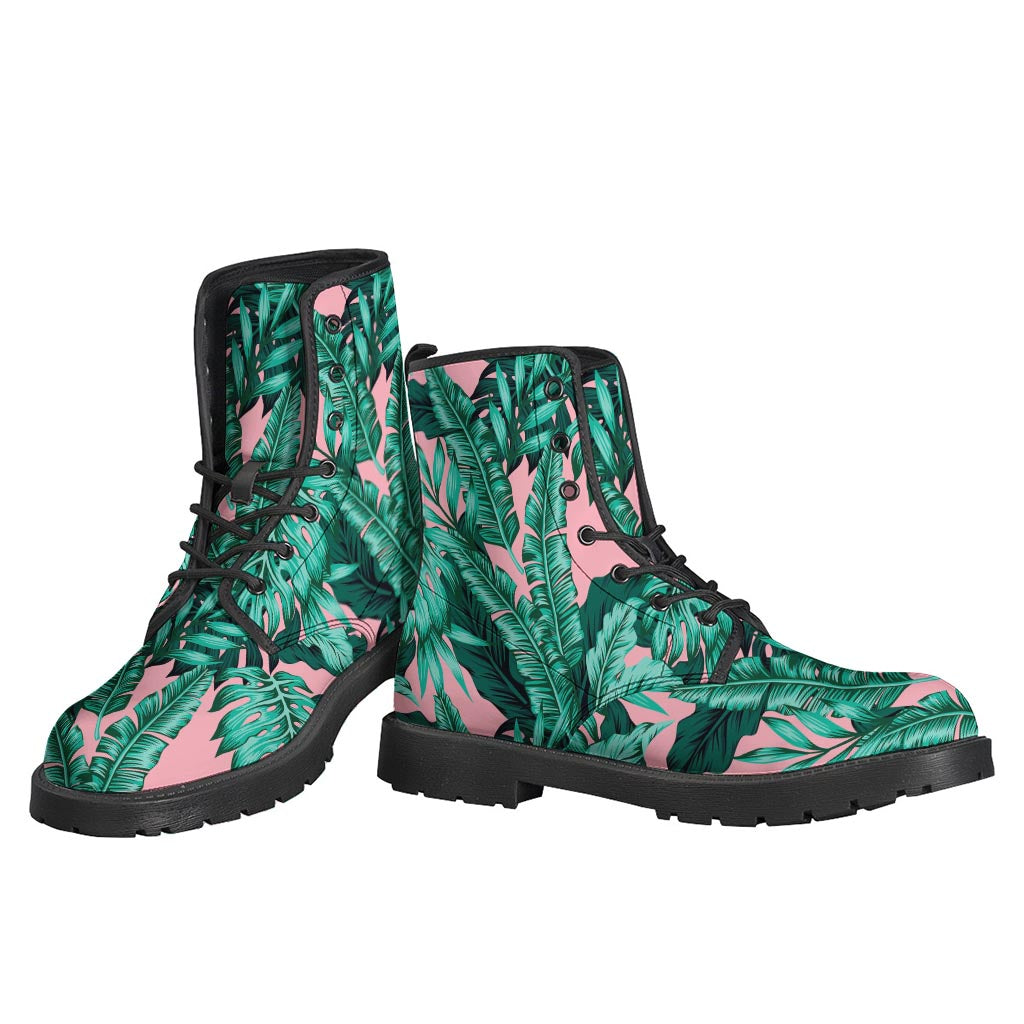 Teal Banana Leaves Pattern Leather Boots for Fashionable Hippies - 1