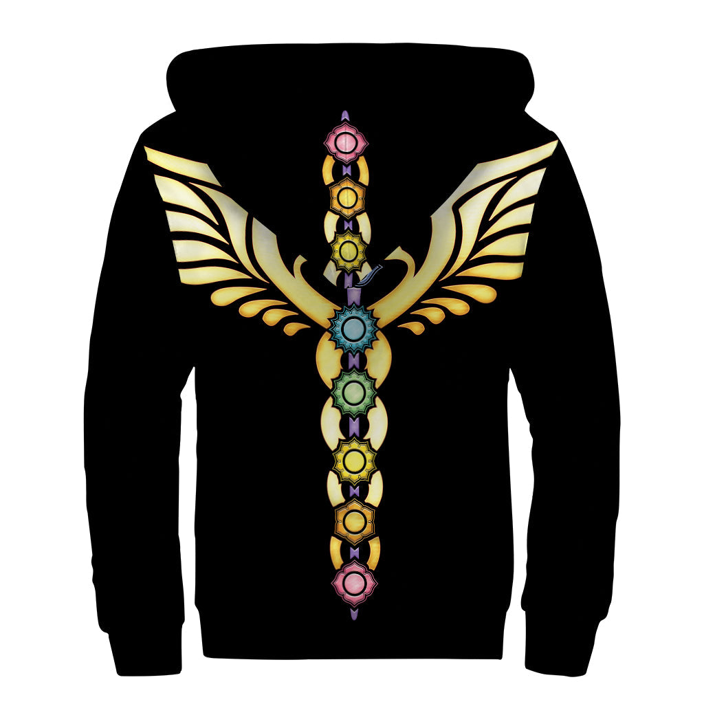 This Sherpa Lined Zip Up Hoodie is perfect for those who embrace the hippie style. Featuring a unique design with the seven chakras and a caduceus print, this hoodie is sure to make a statement. The soft Sherpa lining provides warmth and comfort, making it ideal for cooler weather. With a zip-up front and a hood, this hoodie is both stylish and functional. Whether you're heading to a music festival or just hanging out with friends, this hippie-inspired hoodie is a must-have addition to your wardrobe.