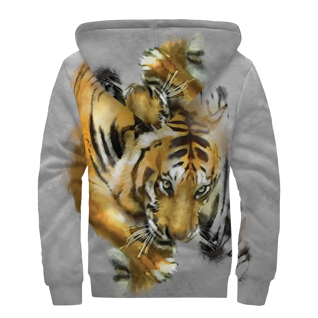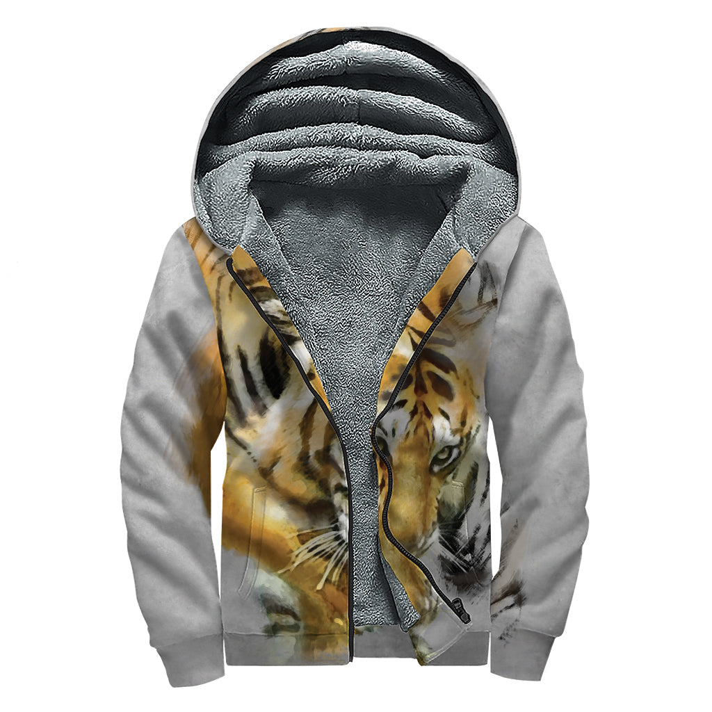 This Sherpa Lined Zip Up Hoodie is the perfect addition to any hippie's wardrobe. Featuring a unique tiger painting print, this hoodie combines style with comfort. The Sherpa lining provides extra warmth on chilly days, while the zip up design makes it easy to layer over your favorite bohemian outfit. Whether you're heading to a music festival or just hanging out with friends, this hoodie is sure to keep you cozy and stylish all day long. Made from high quality materials, this hoodie is built to last and will quickly become a staple in your hippie wardrobe.