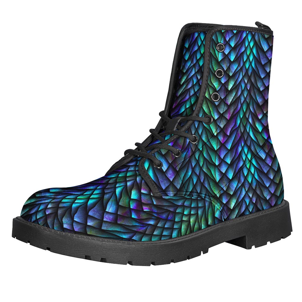 Step out in style with these unique hippie Leather Lightweight Boots featuring a stunning turquoise dragon scales pattern print design. Handcrafted with high-quality leather, these boots are not only stylish but durable and comfortable too. The lightweight construction ensures all-day wearability while the eye-catching print adds a touch of bohemian flair to any outfit. Whether you're heading to a music festival, exploring the great outdoors, or simply want to add a pop of color to your look, these hippie Leather Lightweight Boots are the perfect choice for free-spirited individuals who appreciate both style and comfort.