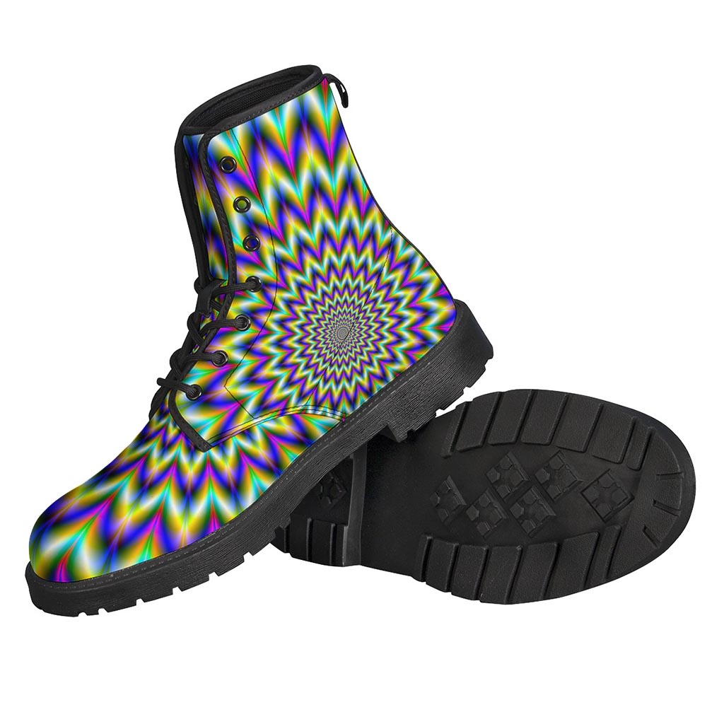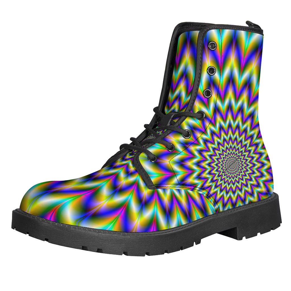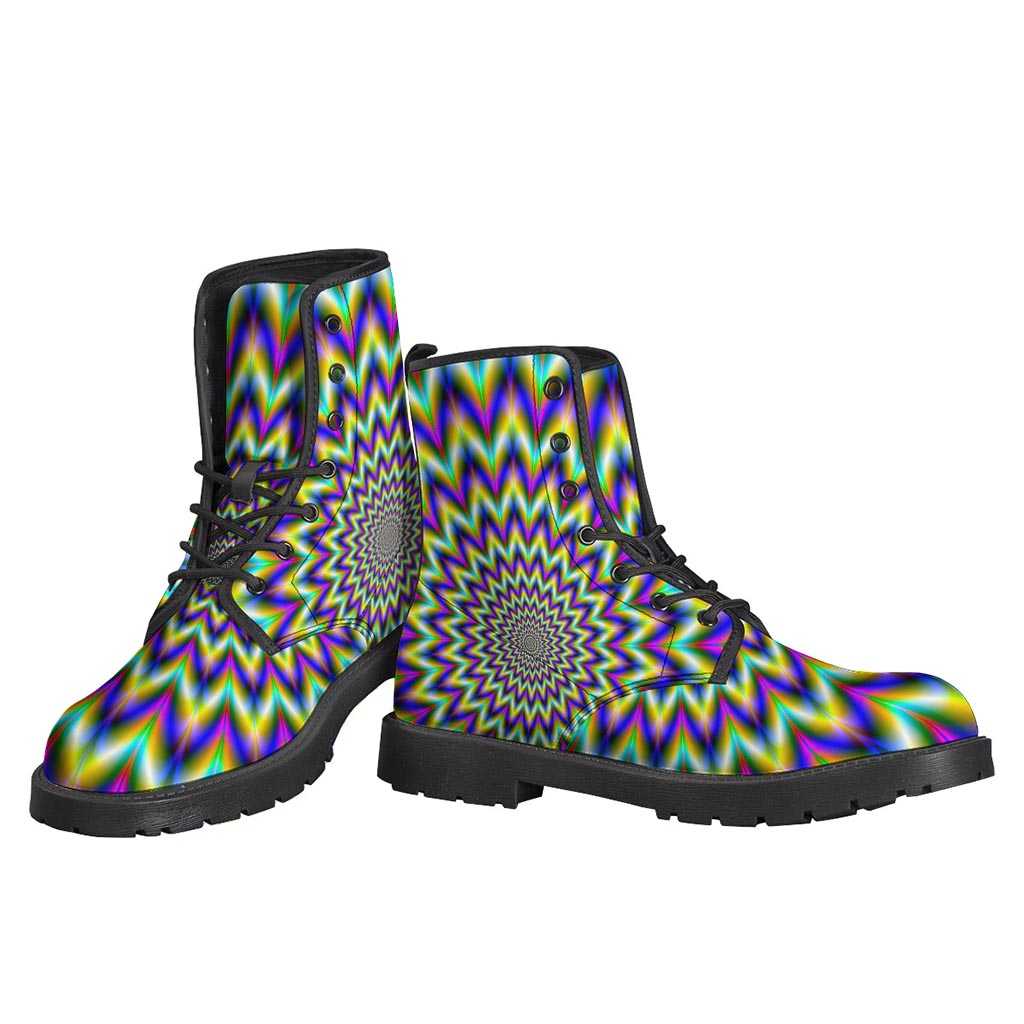 These boots are a must-have for any modern-day hippie looking to add a touch of bohemian style to their wardrobe. Made from lightweight leather, these boots are both stylish and comfortable for all-day wear. The vibrant Twinkle Psychedelic Optical Illusion design adds a fun and playful touch to any outfit, perfect for festivals, concerts, or everyday wear. With a unique pattern that is sure to stand out, these boots are a statement piece that will set you apart from the crowd. Embrace your inner hippie and step out in style with these eye-catching leather boots.